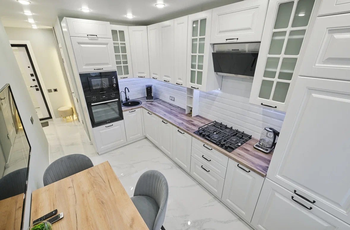 Встроенный кухонный гарнитур с фурнитурой Германия и бытовой техникой: большой встроенный холодильник Vestel, автоматическая зерновая кофе машина , посудомоечная машина Candy, духовой шкаф Hotpoint-Ariston, варочная панель Gerenje из стеклокерамики, вытяжка Hotpoint-Ariston, чайник Maunfeld с возможностью выбора температуры, встраиваемая микроволновая печь Zigmund and Shtain, встраиваемая стиральная машина Hansa.