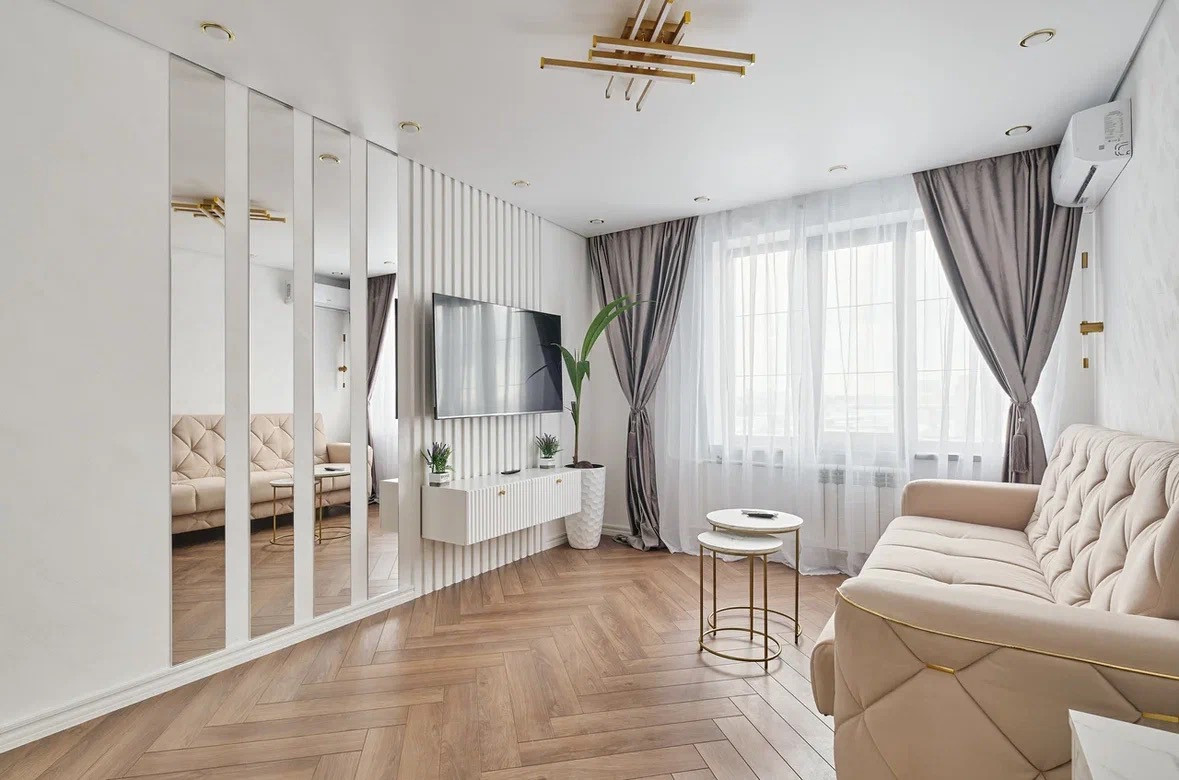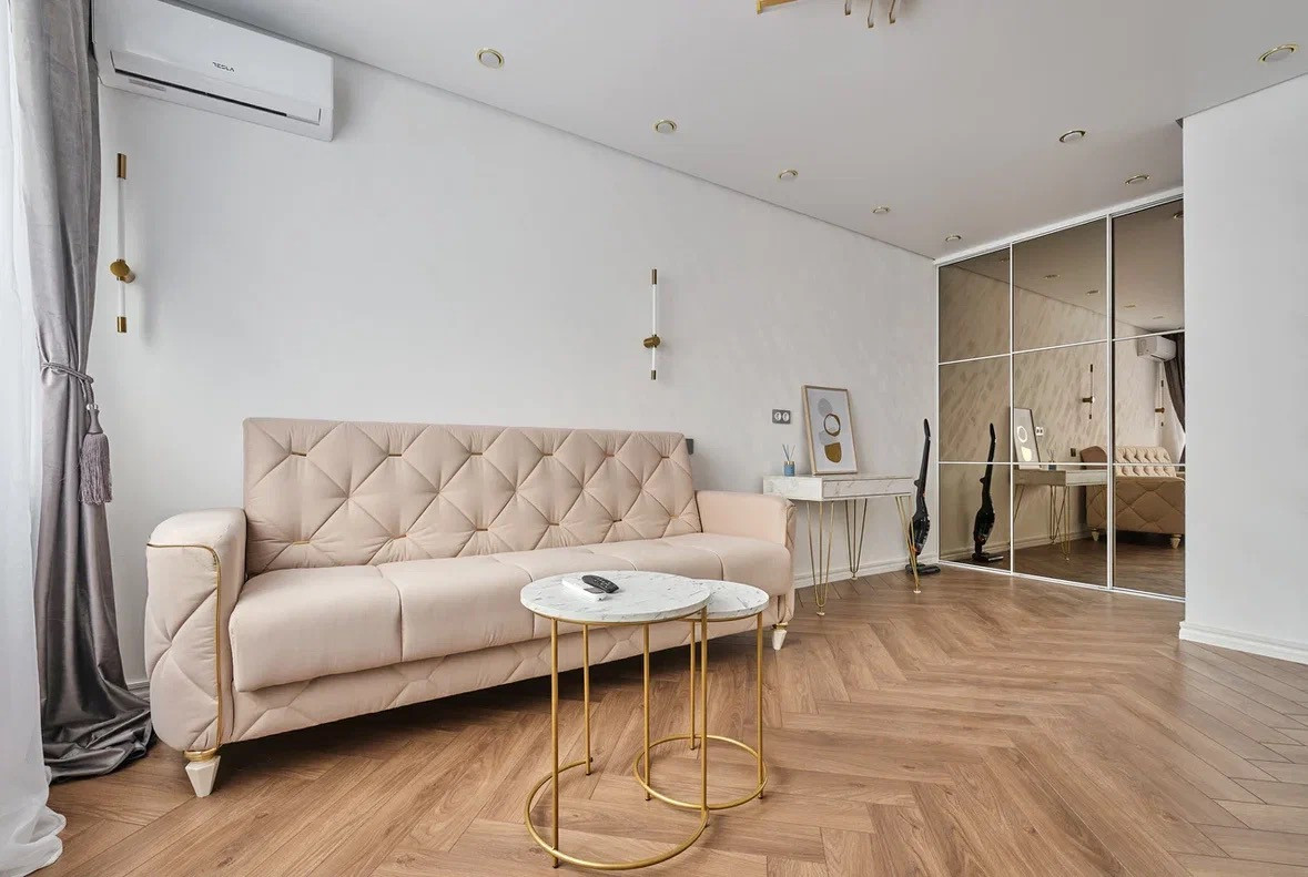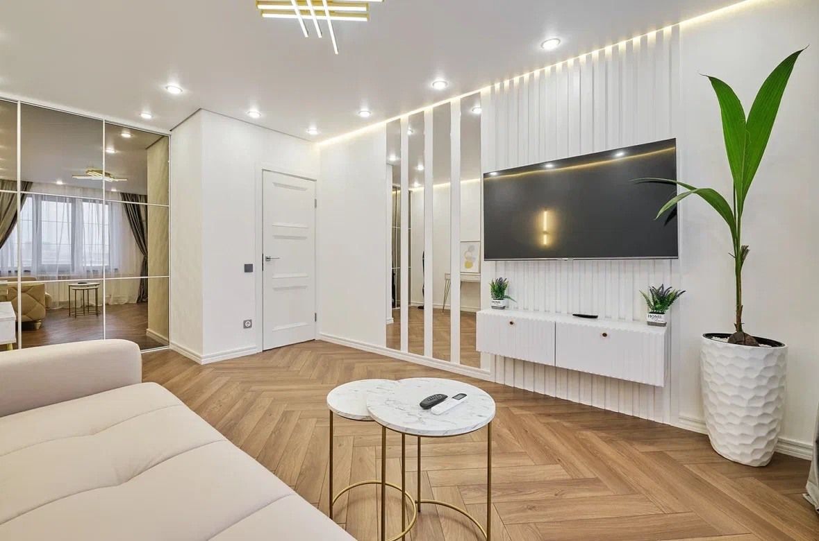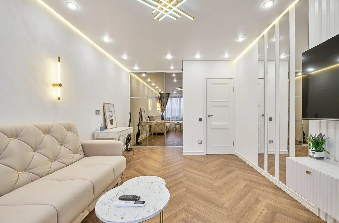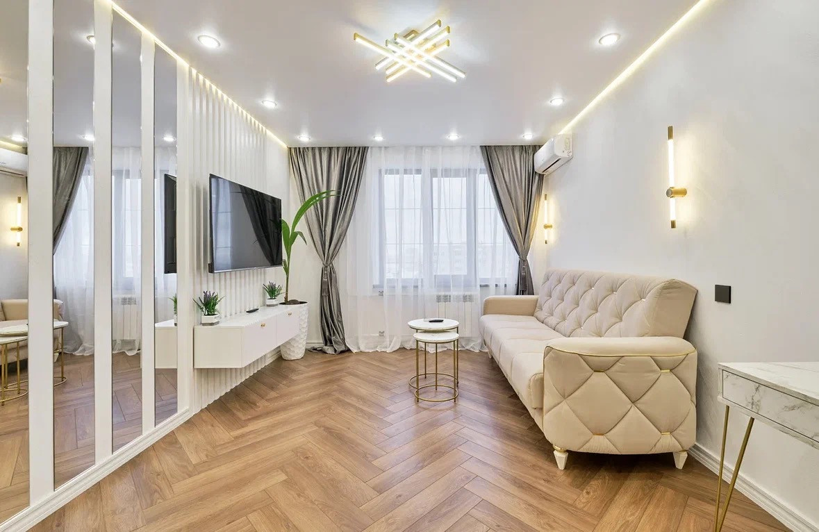 Комната: пол- наборный ламинат Германия, стены декоративная штукатурка. Одна стена выполнена частично из реек и зеркал. Парящий потолок с подсветкой. Вместительный встроенный шкаф, консольный стол, журнальный столик, большой диван(раскладывается) с ортопедическим основанием, тумба под тв, сплит система ( охлаждение и обогрев), тв с smart tv и wi fi 55 диагональ.