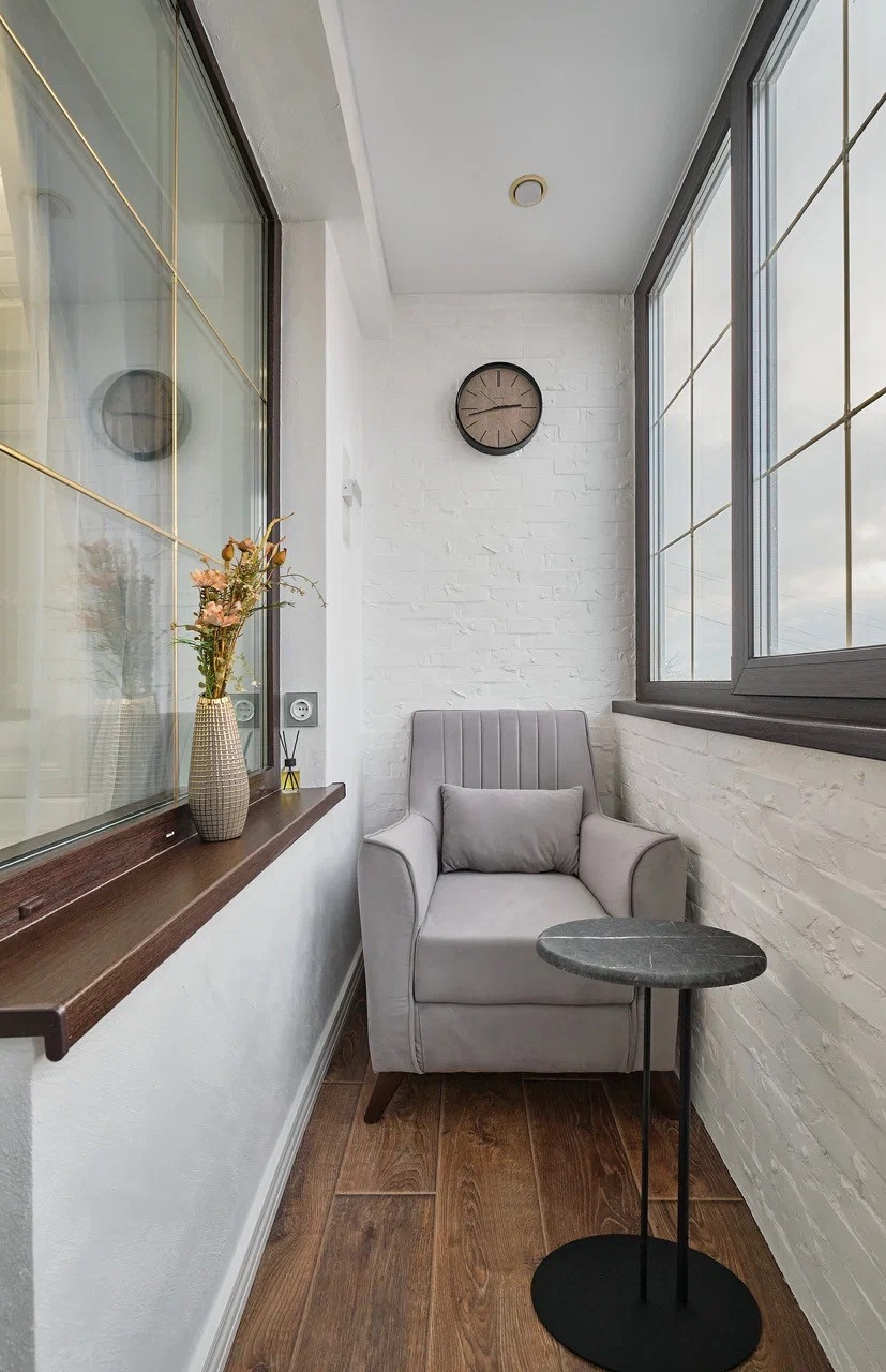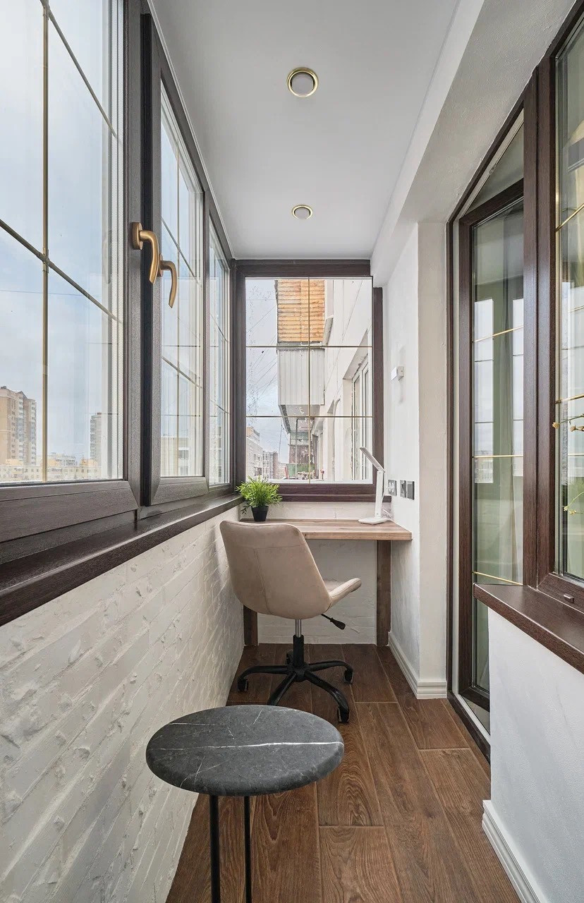 Балкон: пол с подогревом, стены декоративная штукатурка и клинкерный камень. Сделан под уютный кабинет для работы и отдыха. Освещение, розетки.