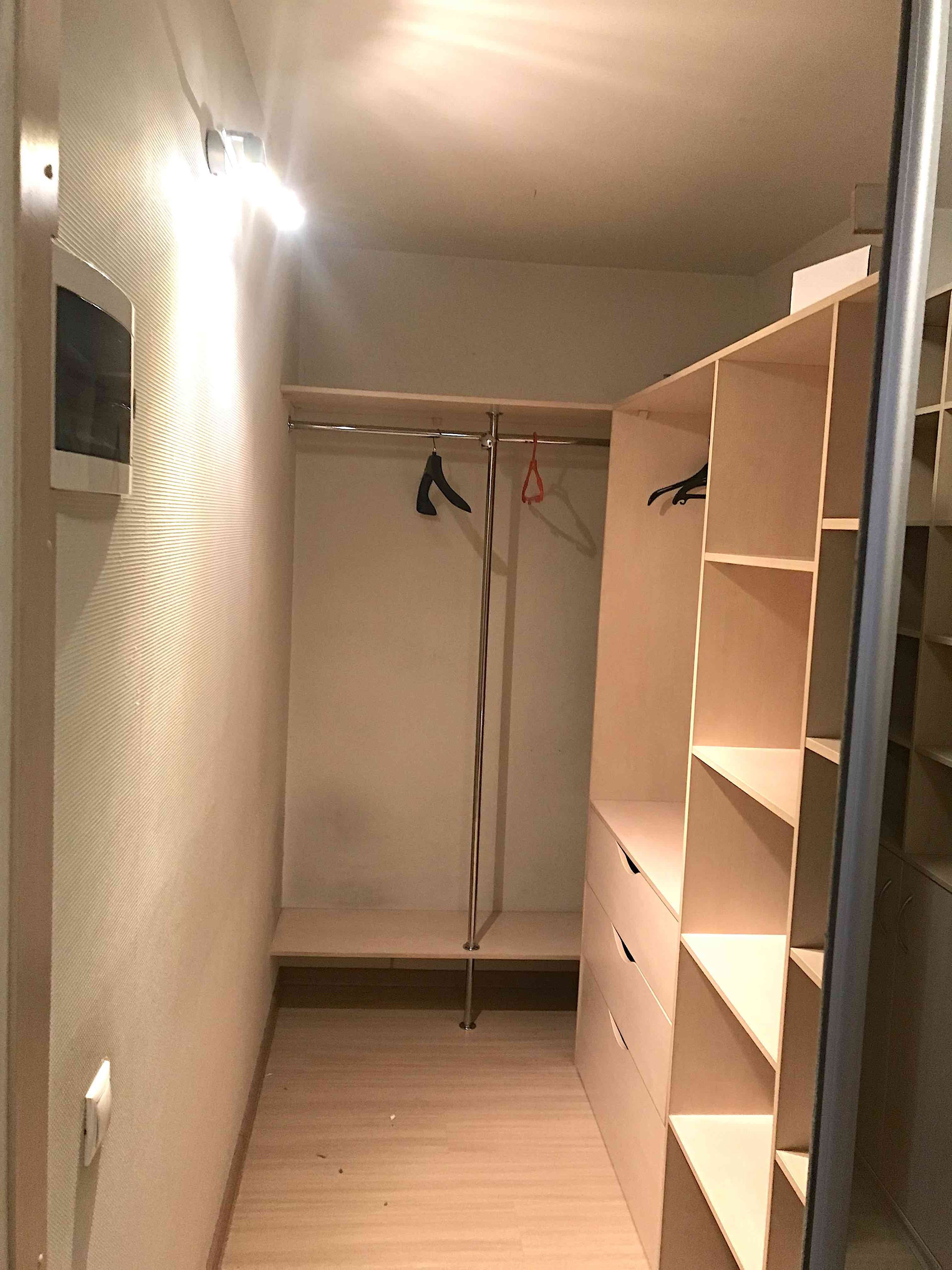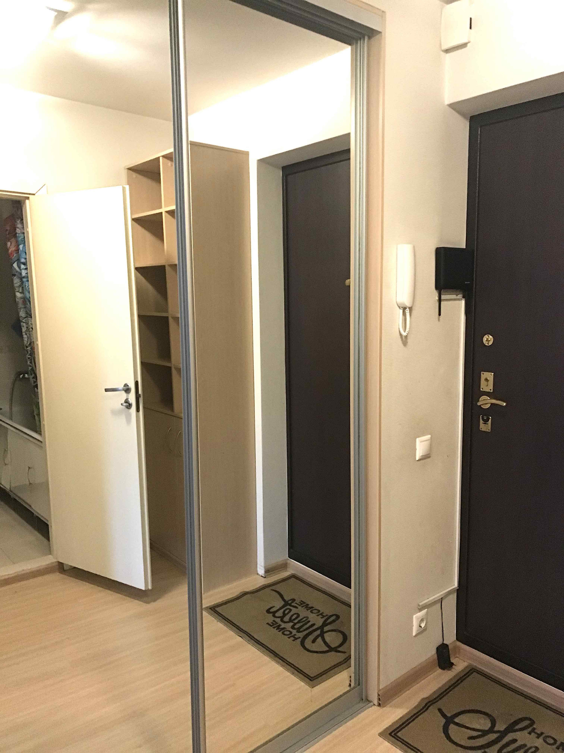 За счет алькова комнаты отгорожена оборудованная гардеробная, вход в которую  из коридора через раздвижные зеркальные двери-купе.