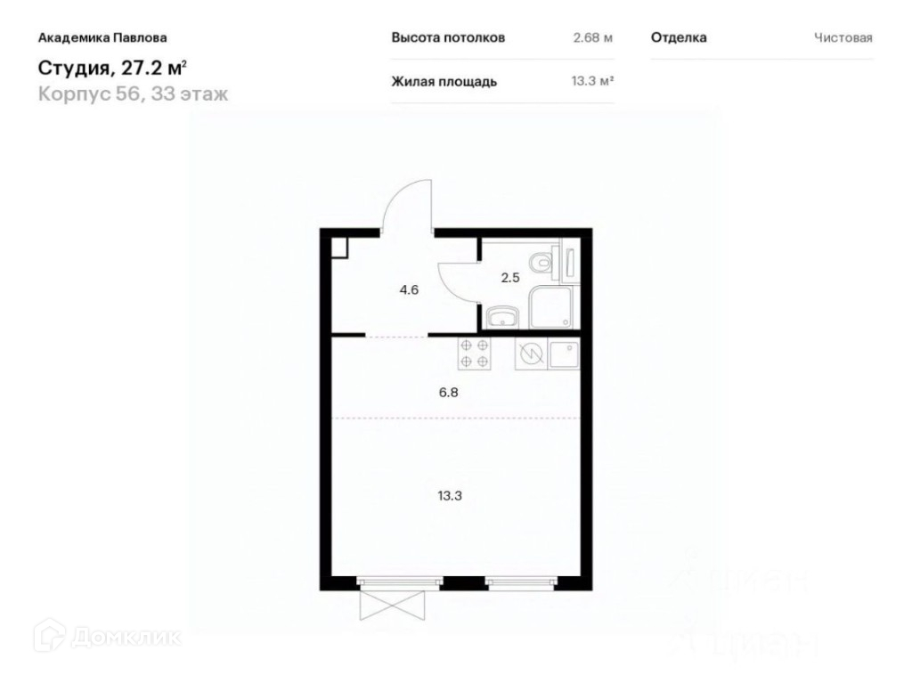 Квартира студия, 27 м2, этаж 7 / 33, на продажу в Москве, улица Академика Павлова, 56вл1