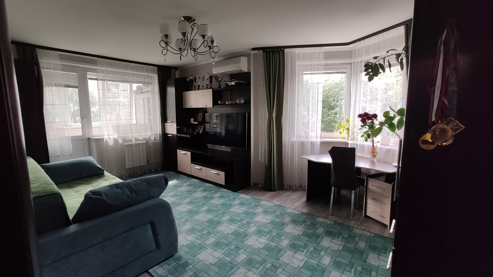 Общая площадь 60 кв.м., комнаты изолированные: большая 19,3 с двумя окнами и угловым эркером и маленькая 14 кв.м. В обеих комнатах просторные застекленные лоджии. Кухня 12,9 кв.м с эркером. Раздельный санузел. На кухне полы с подогревом, подвесные потолки с точечным освещением. В прихожей и коридоре два больших шкафа-купе, остаются покупателям. Также в квартире остается встроенный кухонный гарнитур (столешница - искусственный камень) с необходимой техникой и новый кондиционер. Был произведен качественный ремонт с заменой окон, дверей, радиаторов, сантехники.