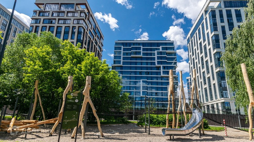 Продуманная инфраструктура комплекса предусматривает комфортное проживание: двор без машин (подземный паркинг с доступом на лифте из каждого корпуса, функциональное разделение на площадки для детей и взрослых, зоны для отдыха и занятий спортом, беговые и велодорожки, обширная парковая территория 7 га, вымощенная дорожками для прогулок и обустроенная набережная реки Раменки.