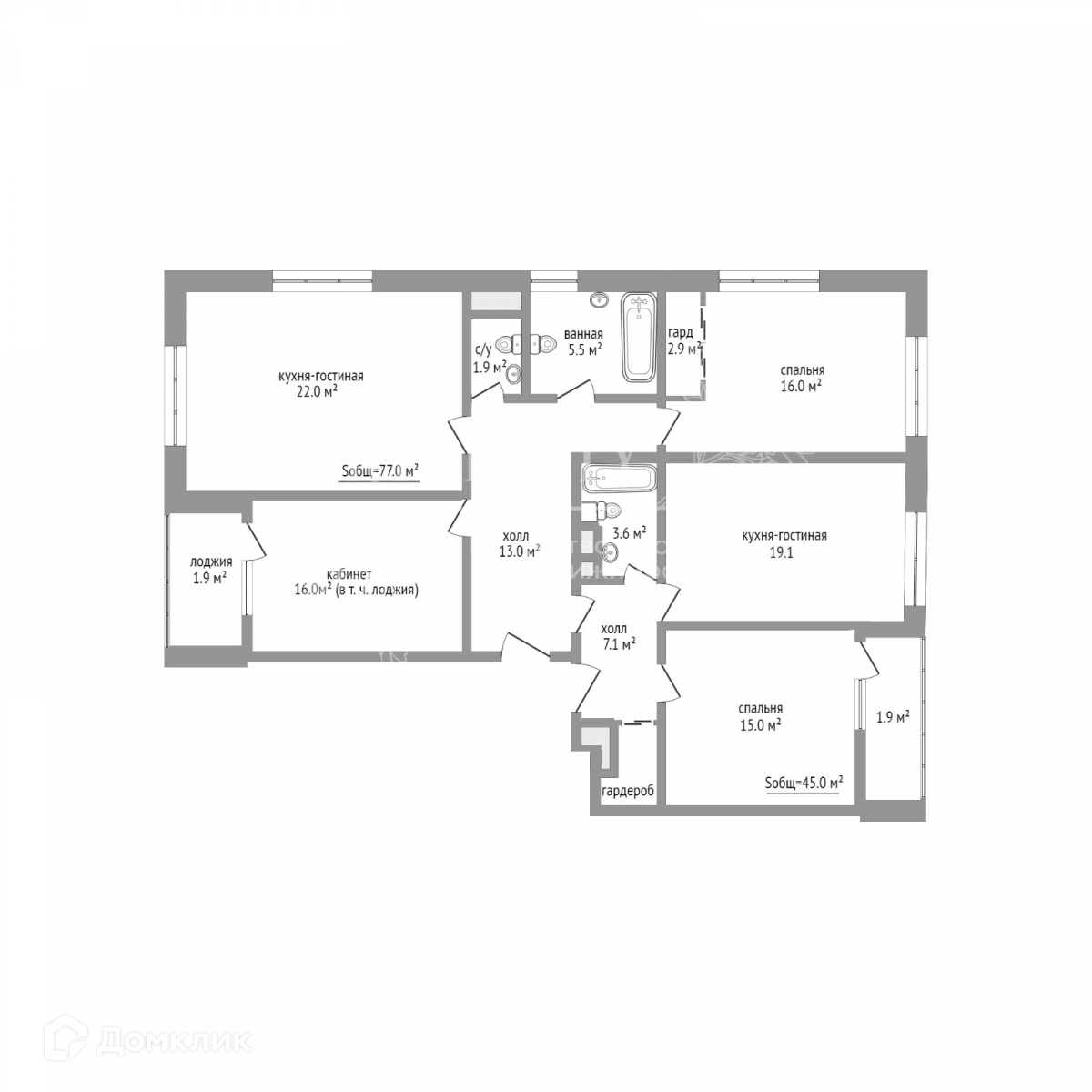 - 76,8 м2 : Окна на 2е стороны (во внутренний двор и на внешнюю сторону), Кухня-гостиная 22м2, Кабинет – 16м2, Спальня – 19м2 с гардеробной 3м2, Изолированный с/у (ванная с окном 5,5м2, туалет 2м2), Просторная утепленная лоджия с рабочим местом и теплым полом.