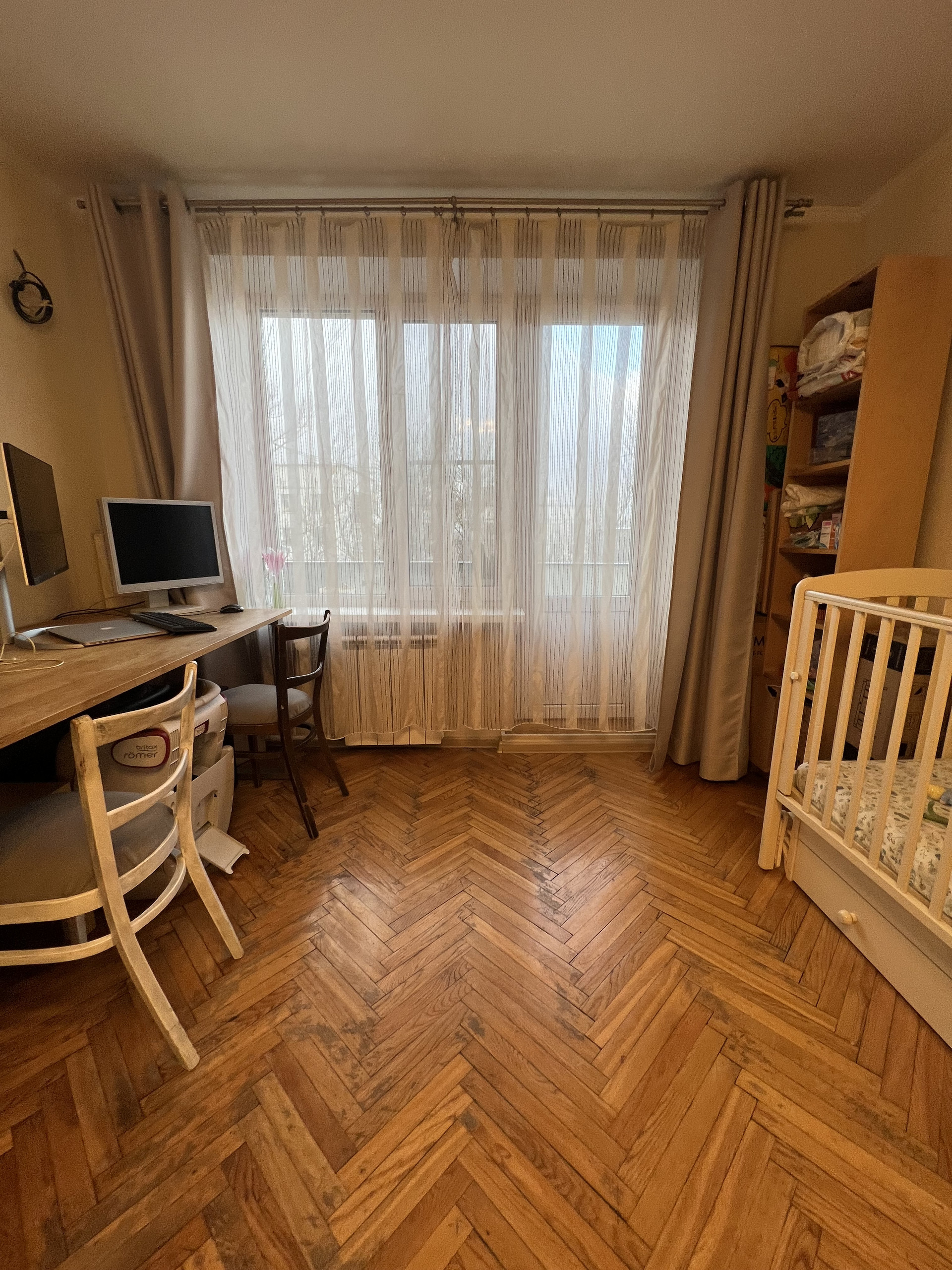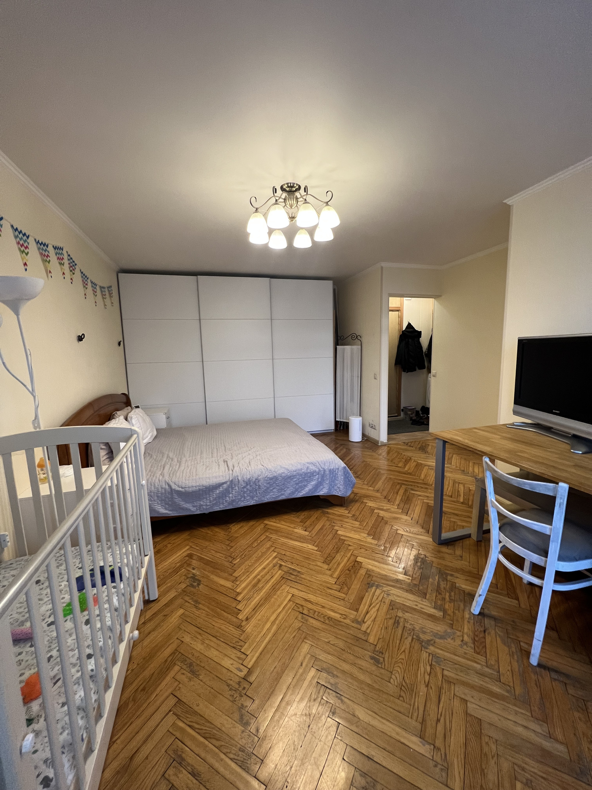 Жилая 21,4 кв м - просторная комната, выход на балкон, вид во двор, тихо. В комнате большой вместительный шкаф-купе во всю стену высотой до потолка.