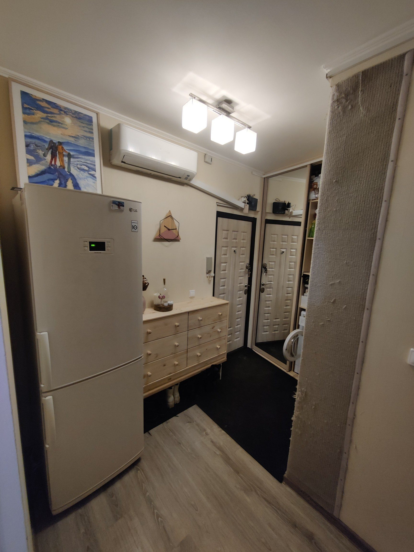 - в коридоре - шкаф-купе, деревянный комод, холодильник LG, стиральная машинка Indesit, мощный кондиционер Mitsubishi, рассчитанный на всю площадь квартиры