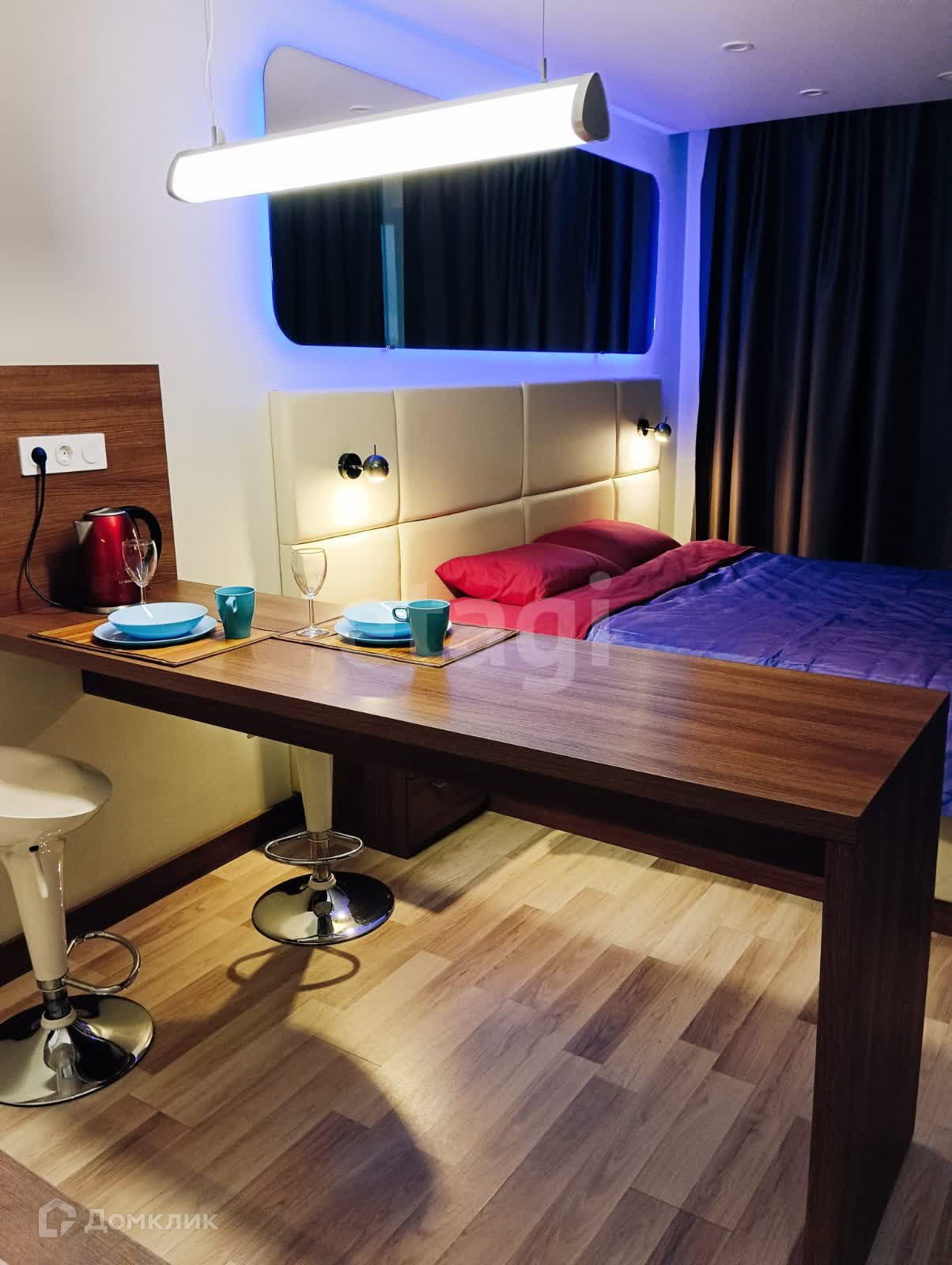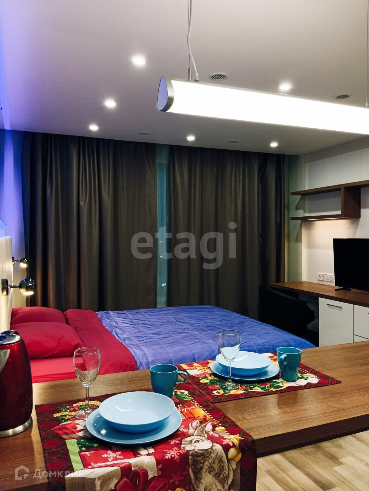 Квартира имеет всё для комфортной жизни: двухместная кровать с ортопедическим матрасом, ТВ, интернет, холодильник, стиральная машина, кондиционер, рабочее место, ночная цветная подсветка и прочее.