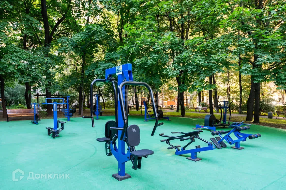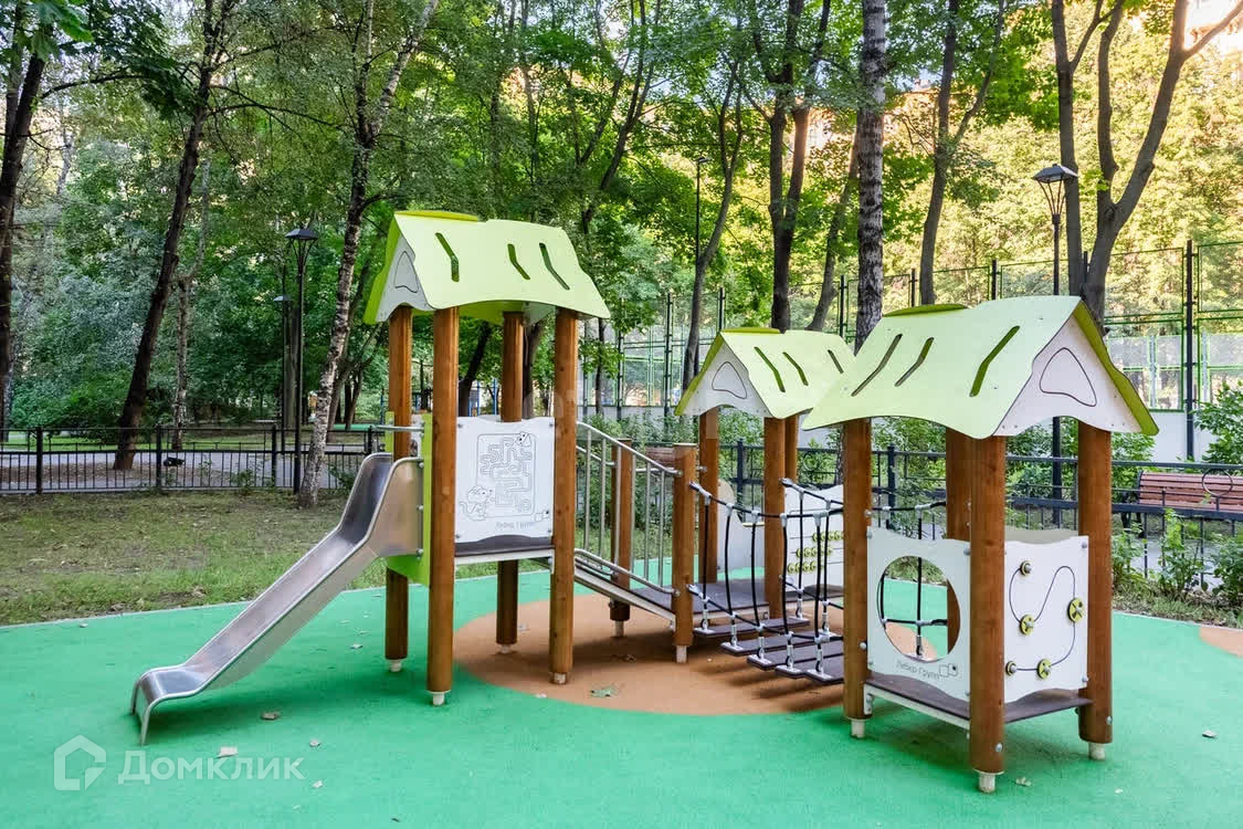 * Большой огороженной благоустроенный зеленый двор, внутри которого располагается детский игровой городок, спортивная площадка с тренажёрами, футбольное поле, а также зона отдыха с фонтаном и деревянными скамейками. Заезд во двор возможен через шлагбаум;
