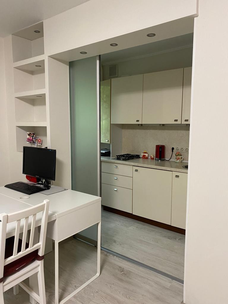 Светлая уютная квартира в отличном состоянии, с европейским ремонтом. Все коммуникации, электроустановочные  и отопительные системы, сантехника, окна и двери новые. Пол из ламината и керамогранита. Высокий первый этаж. Крупноблочный дом с ж/б перекрытиями. Санузел совмещенный с душевой кабиной. Вход на кухню расположен в жилой комнате. Тихий зеленый двор. Чистый подъезд без посторонних запахов. Обжитой район. Готовый арендный бизнес. Свободна юридически и физически.
