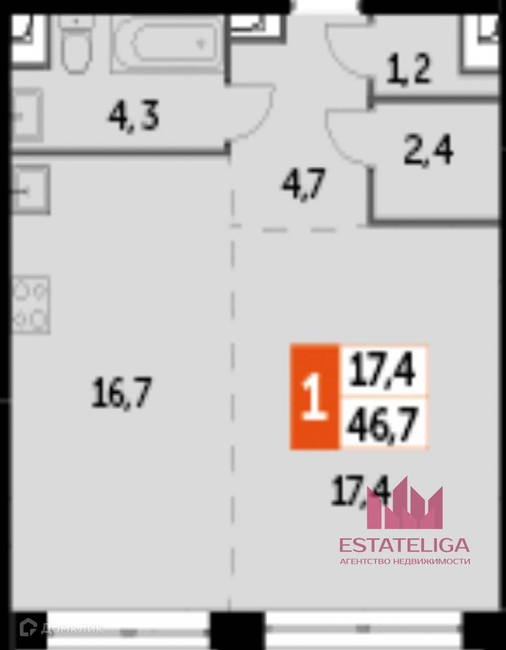 Общая площадь 46.7 м2