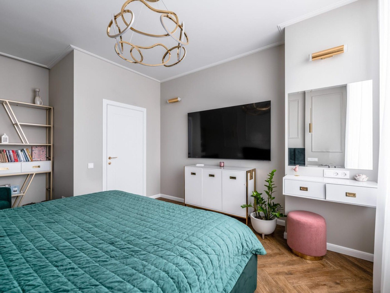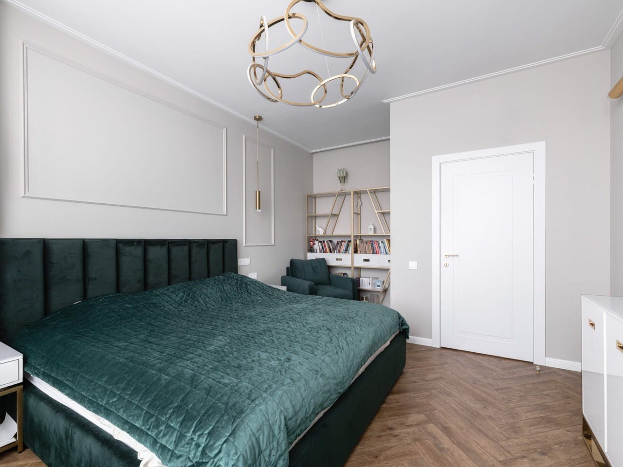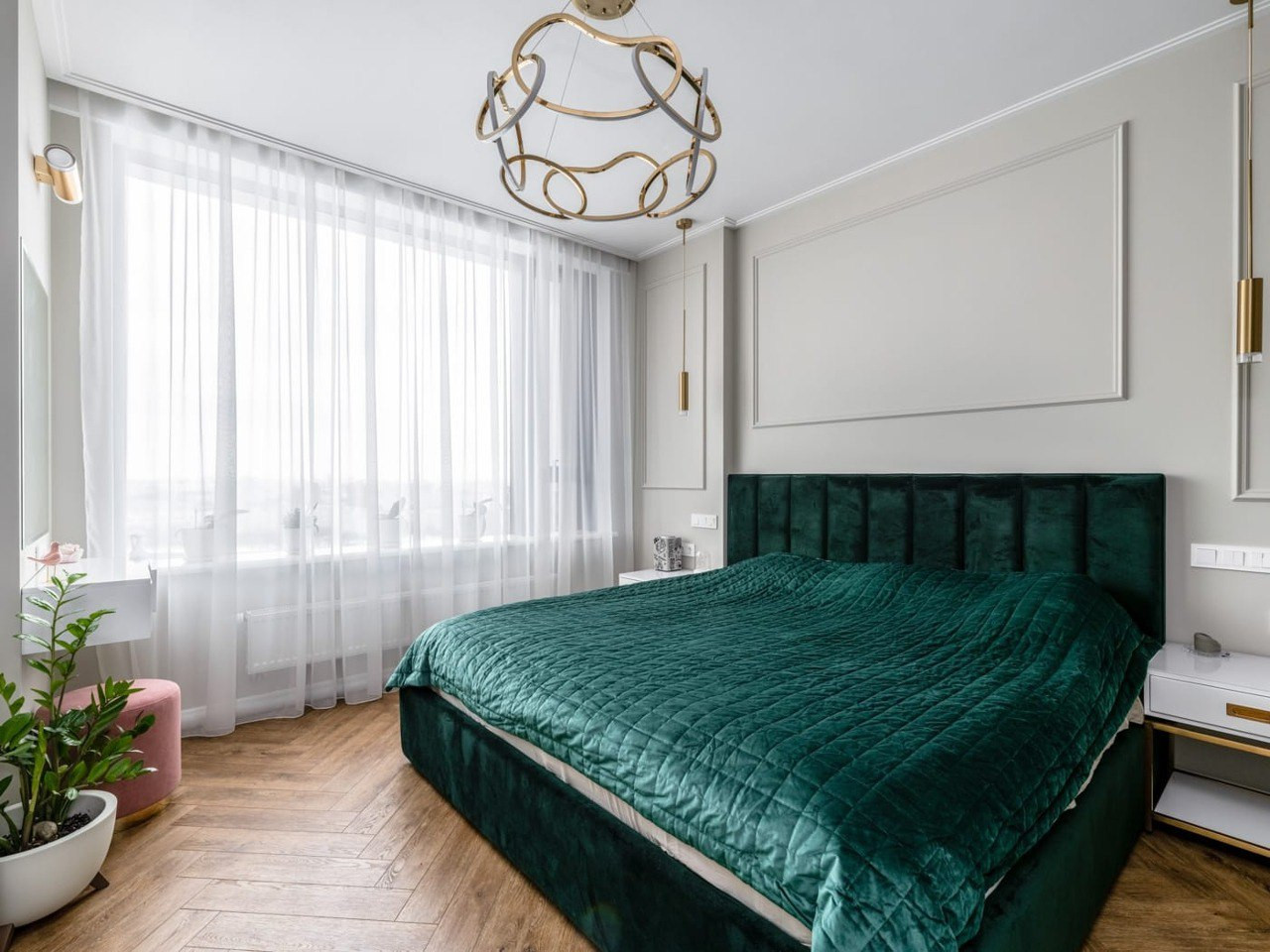 Дорогие световые приборы и текстиль завершают стильное оформление пространства.