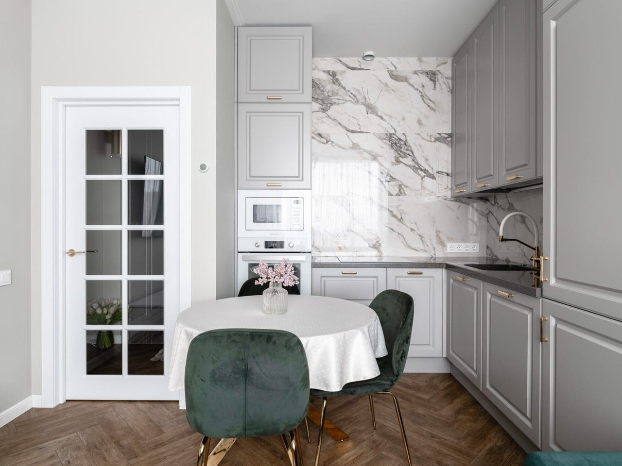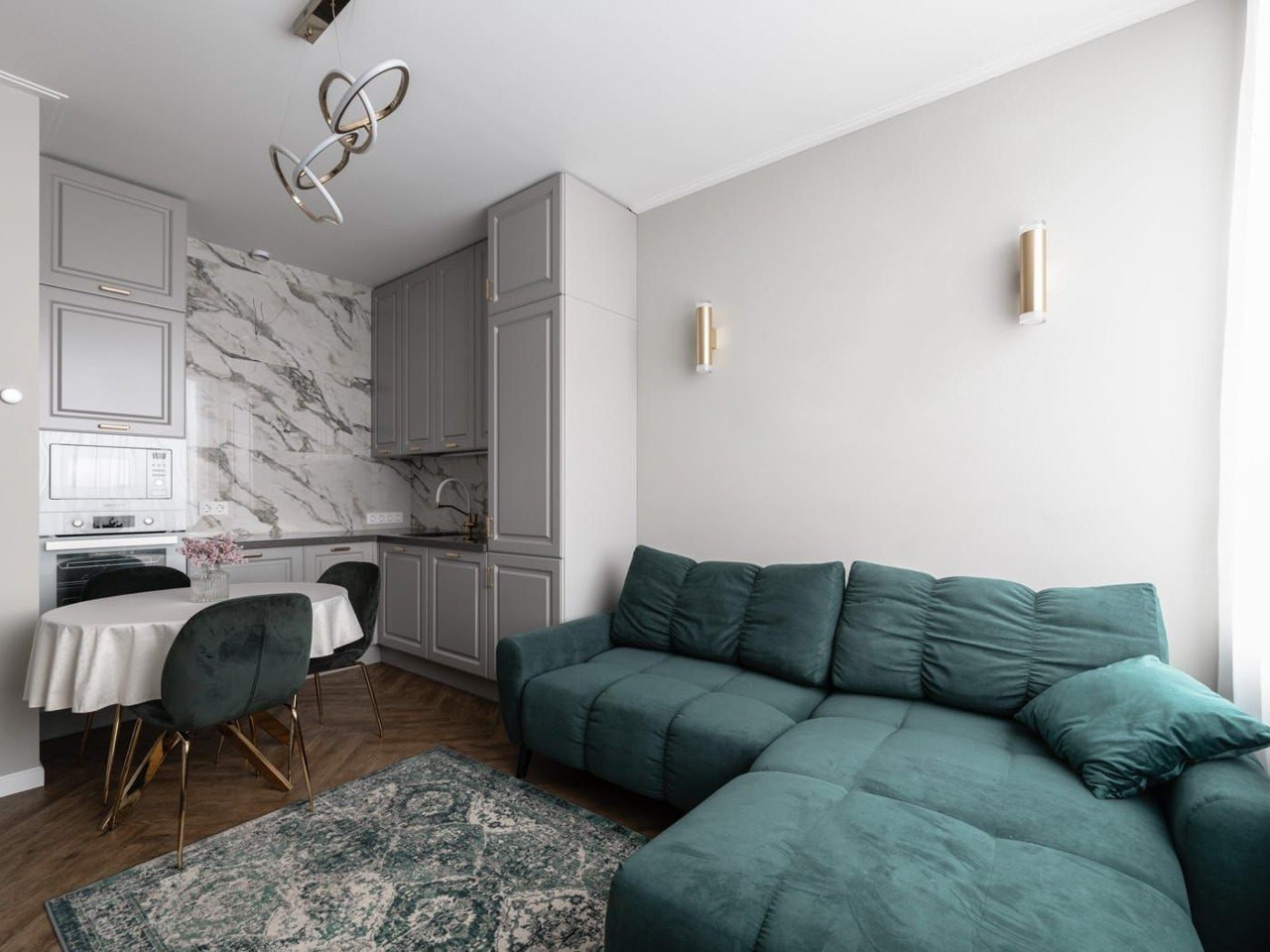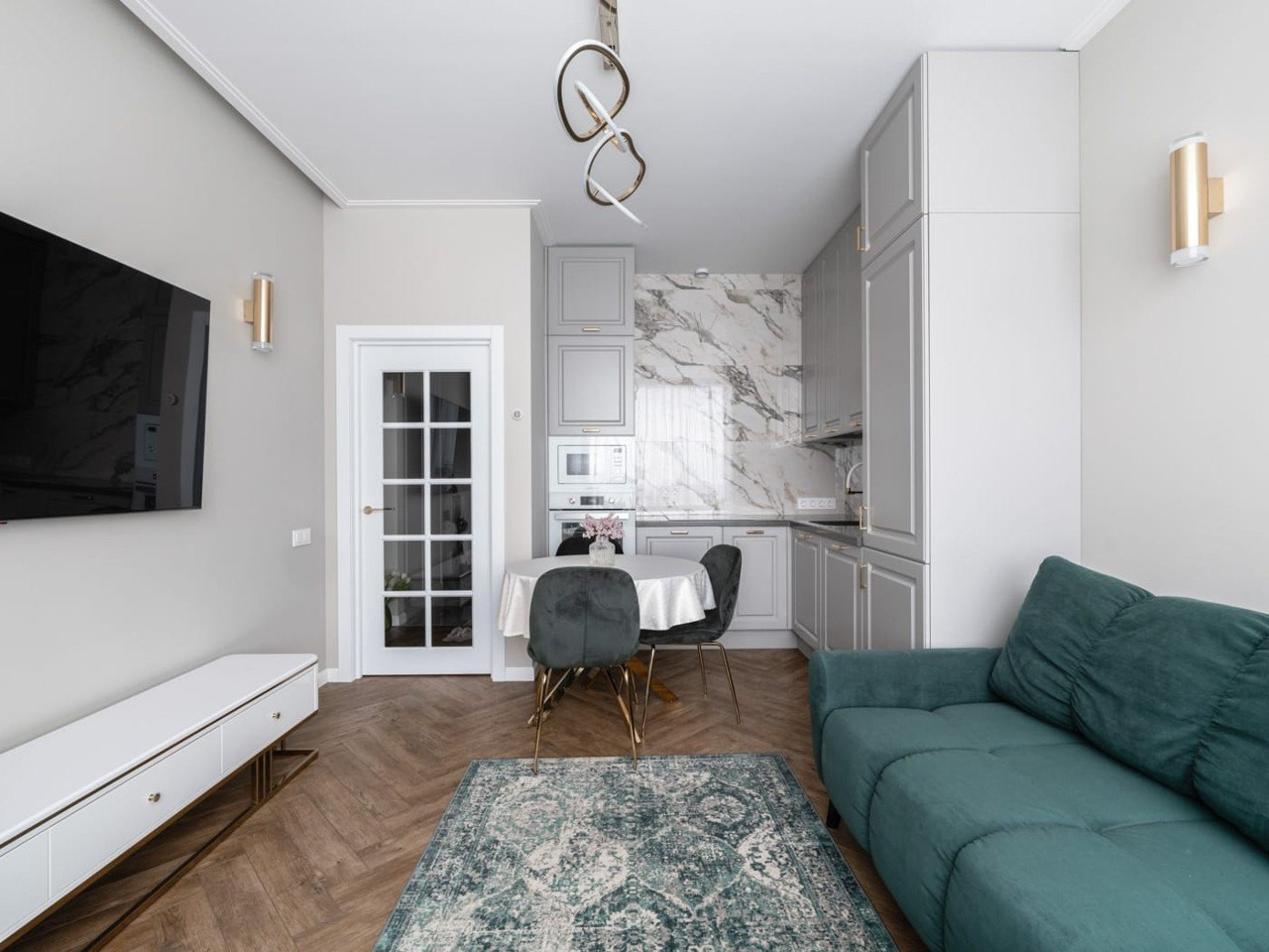 - просторная кухня-гостиная, укомплектованная встроенной мебелью и техникой;