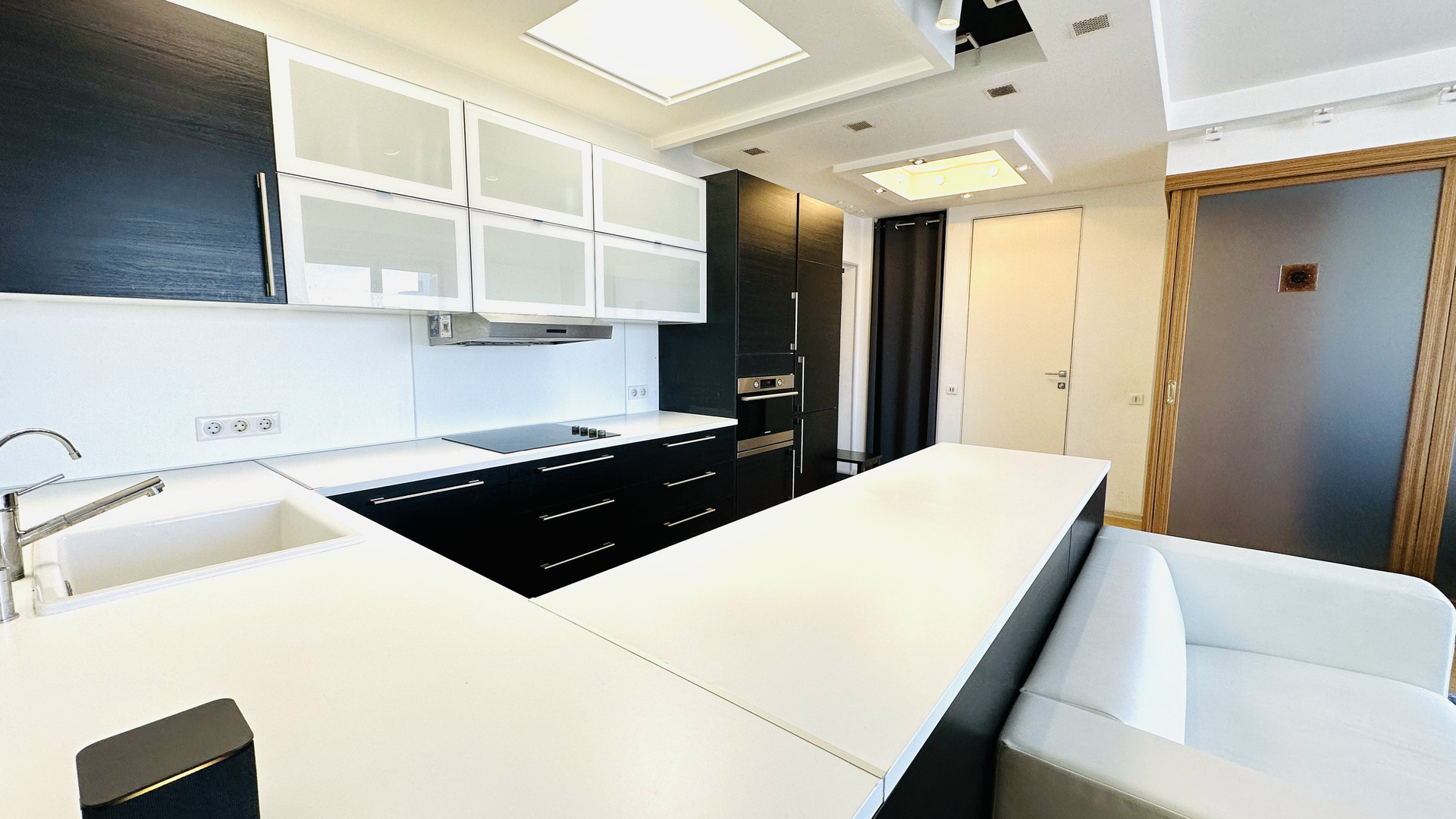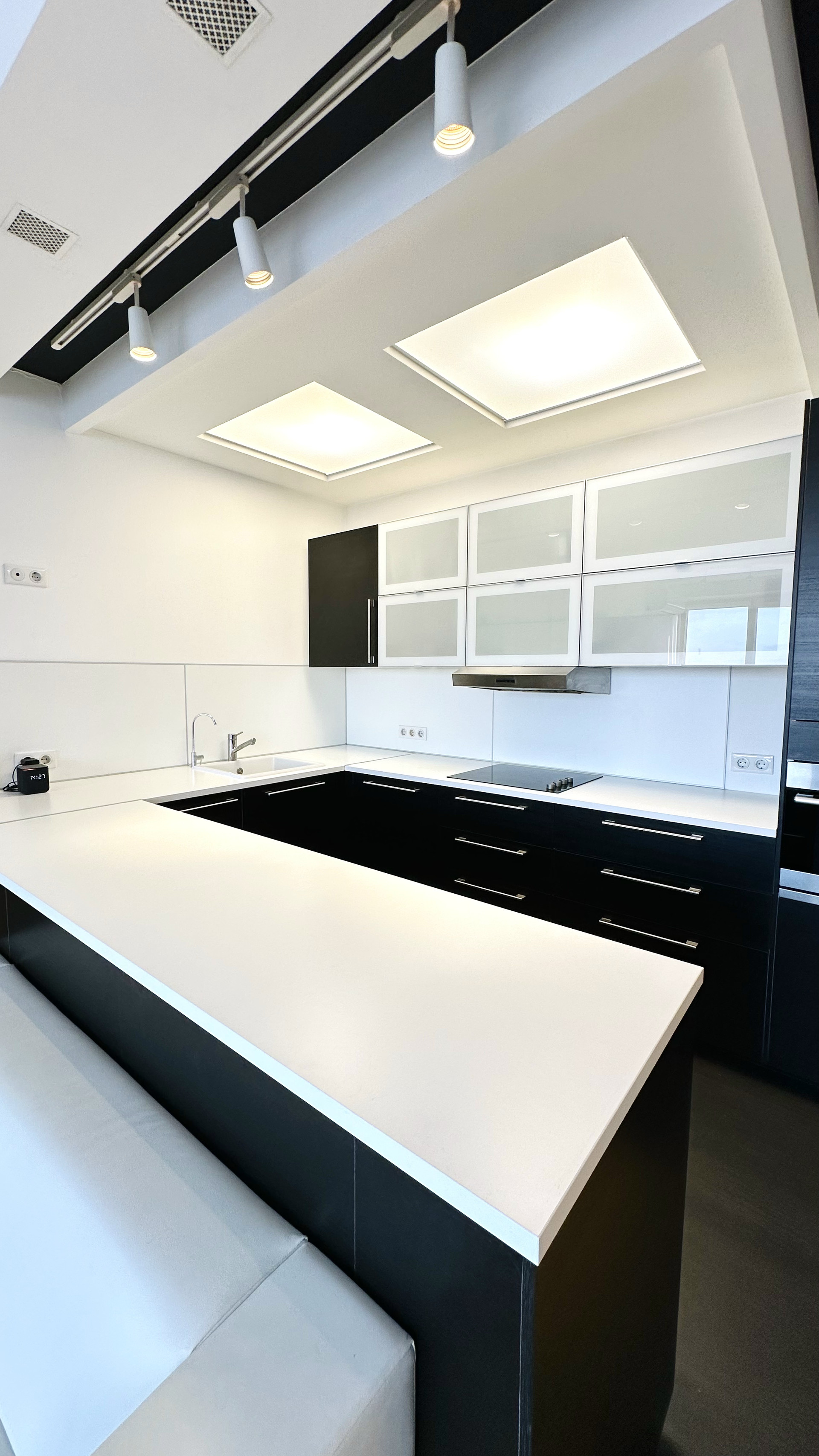 Кухня имеет столешницу 9 метров и оборудована всей необходимой бытовой техникой: плита, духовой шкаф-СВЧ, посудомоечная машина, встроенный холодильник.