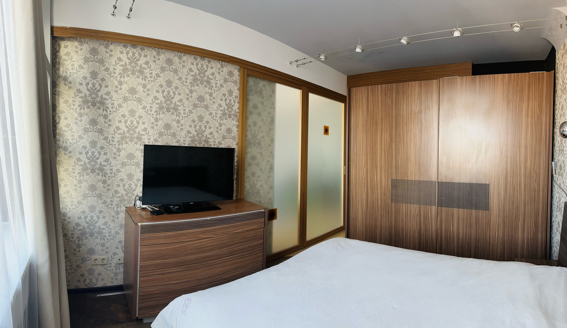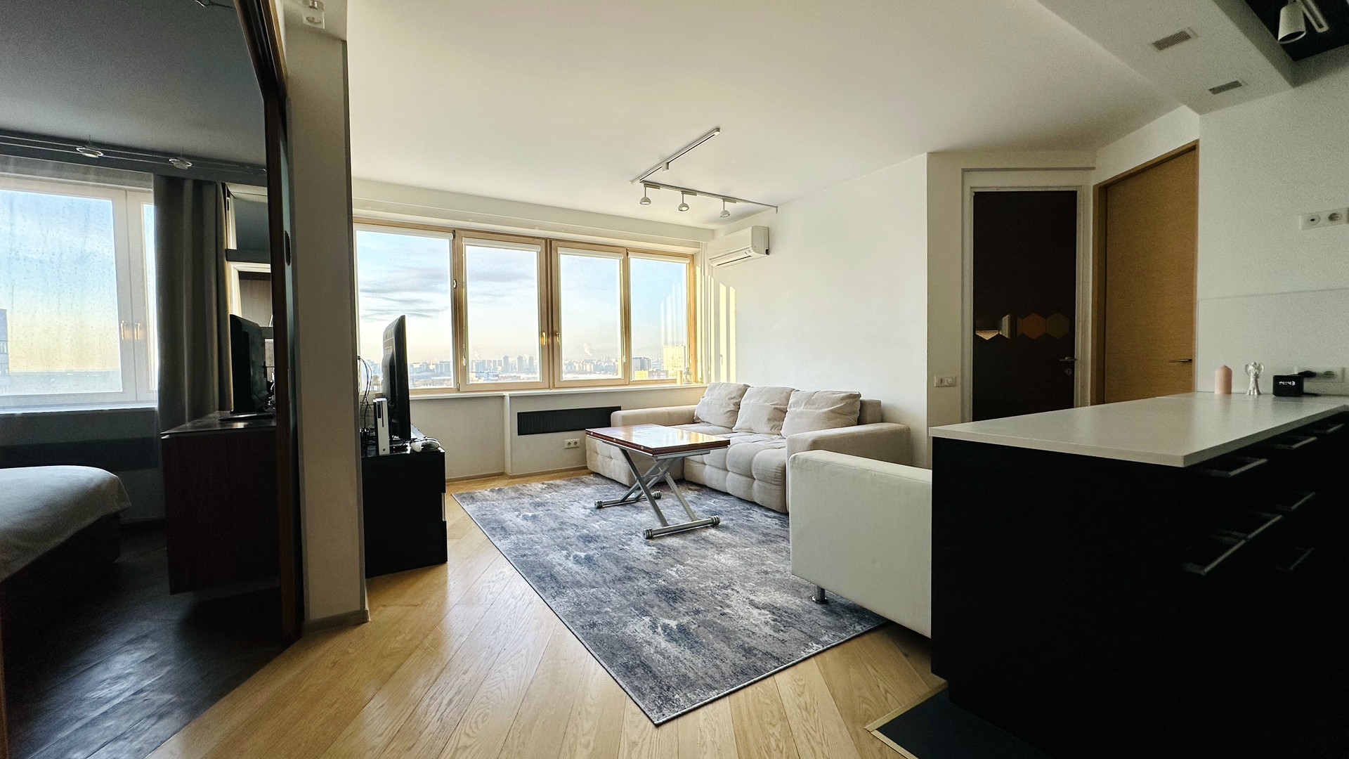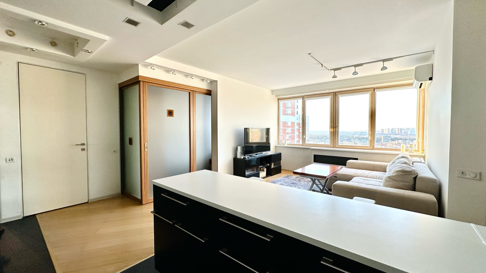 Две изолированные комнаты: спальня (двери раздвижные, витражные, в потолок), а также детская (прекрасно подходит для обустройства кабинета). Просторная гостиная.