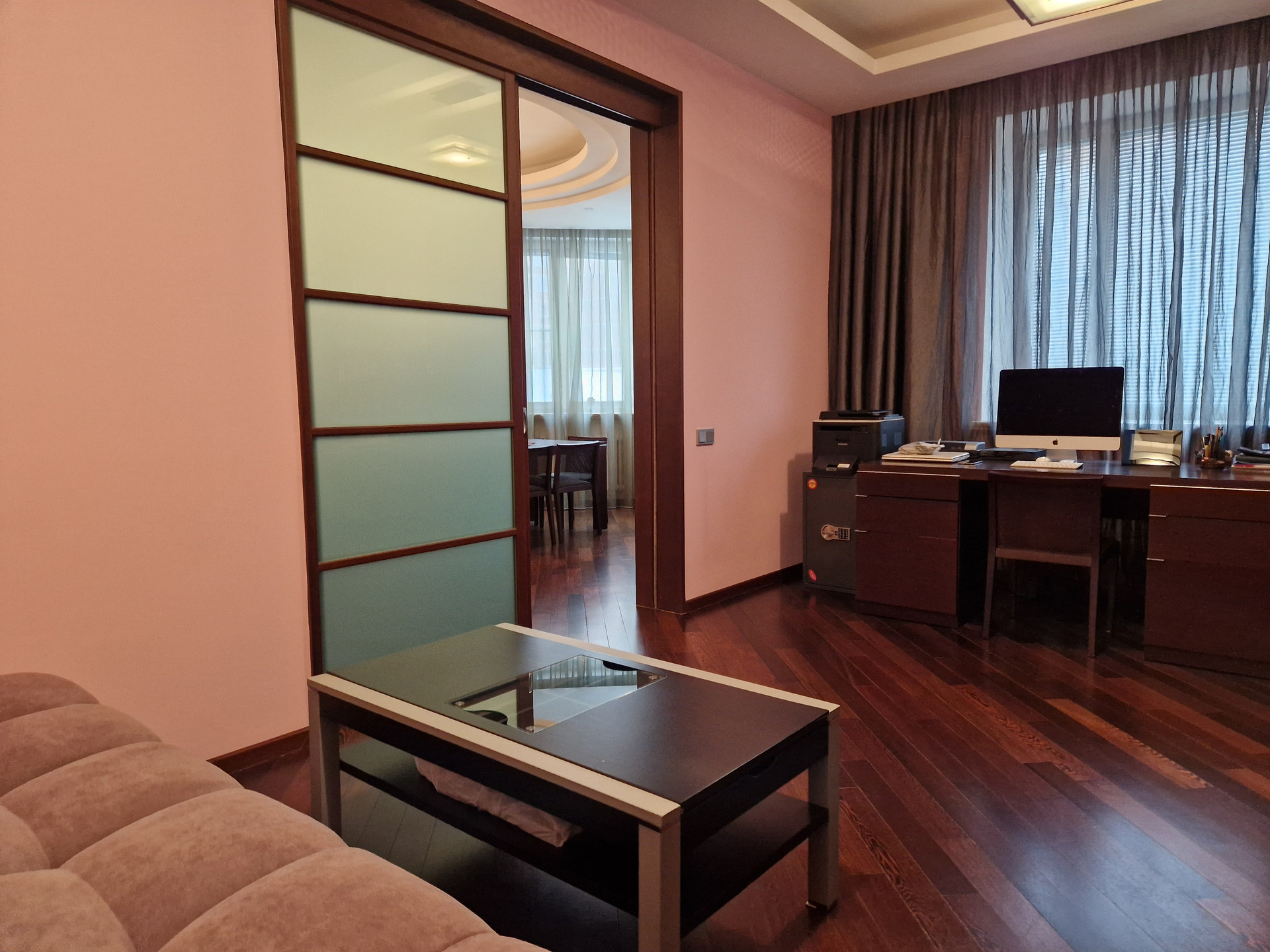 Просторная гостиная(40кв.м) с обеденной зоной сообщается с кухней (15.6кв.м) и кабинетом (20.1кв.м), при входе- гостевой санузел. В приватной части расположены детская (22кв.м), мастер-спальня (18кв.м) с собственным санузлом и выходом на лоджию, вместительная хозяйственная комната и система хранения.
