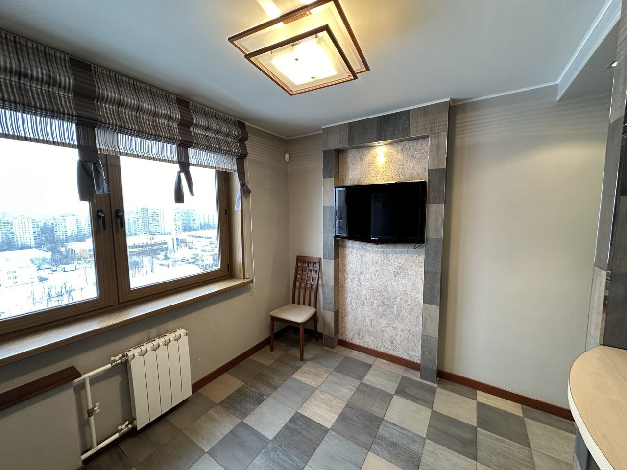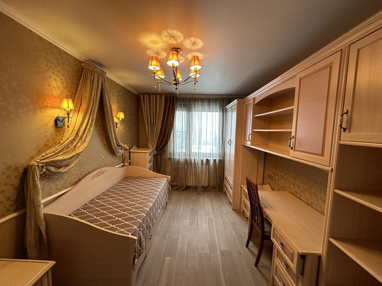 Просторная кухня со встроенной кухней Zetta из натурального дерева с бытовой техникой (холодильник, посудомоечная машина, стеклокерамическая плита, духовой шкаф/печь СВЧ), три изолированные комнаты, комната 1 с выделенной спальной зоной и зоной отдыха, два санузла, застекленные лоджия и балкон.