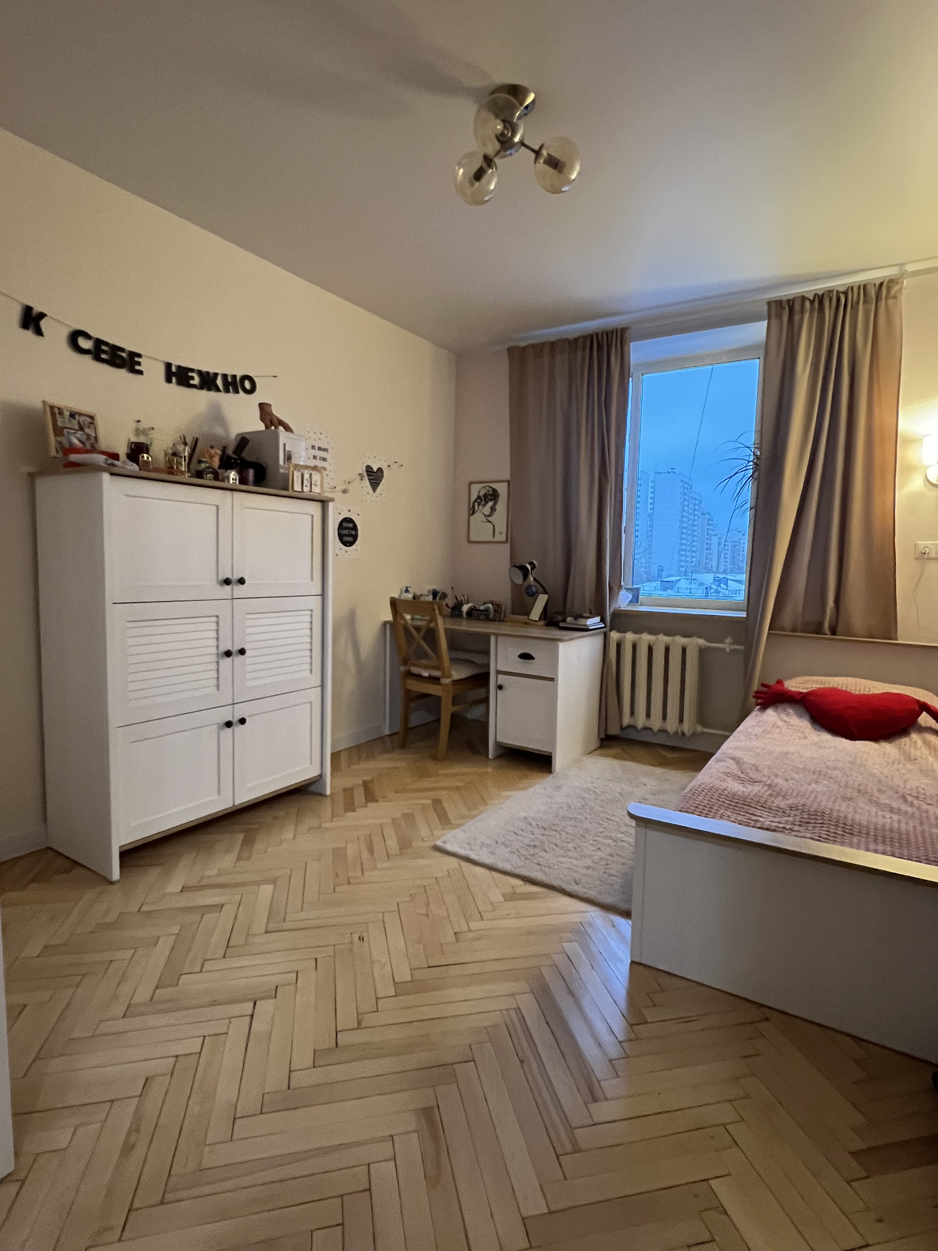 Две комнаты и кухня расположены окнами в тихий двор, одно окно выходит на улицу Академика Королева.