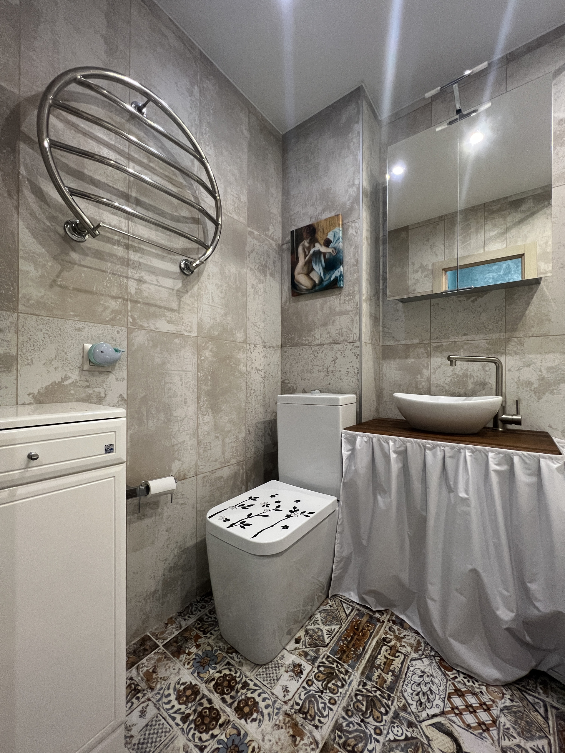 Трубы и радиаторы отопления убраны в ниши и закрыты декоративными решетками.