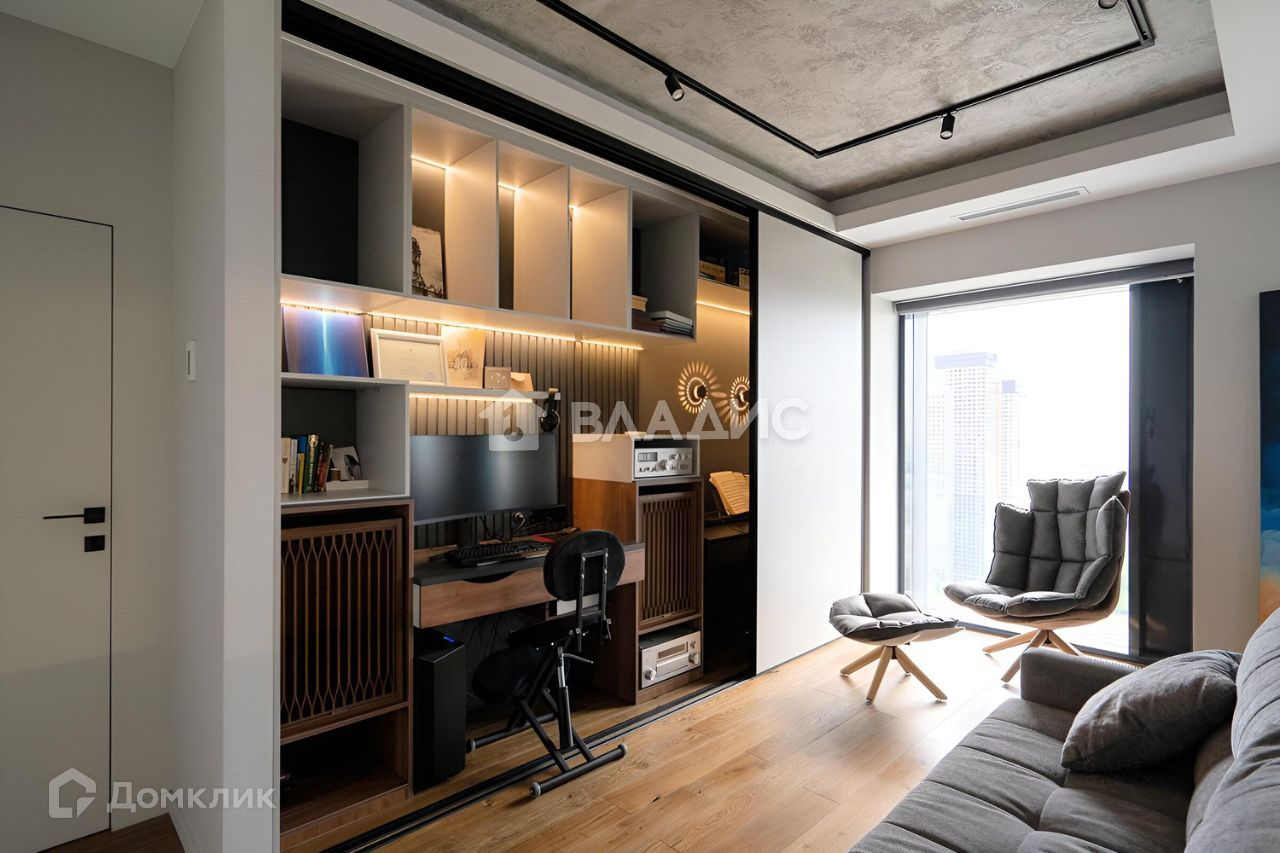 Установлен проектор и экран, экран спрятан в потолок и интегрирован в основной "шкаф", где также сделано полноценное рабочее место, куда помещается ПК с экраном до 35'. Аудиосистема hifi, японский kenwood 1979 года, при желании -  продажа дополнительно.