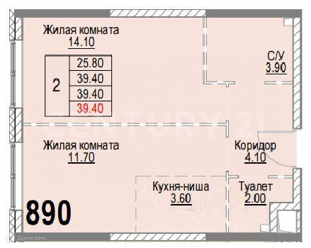 Общая площадь 39.4 м2