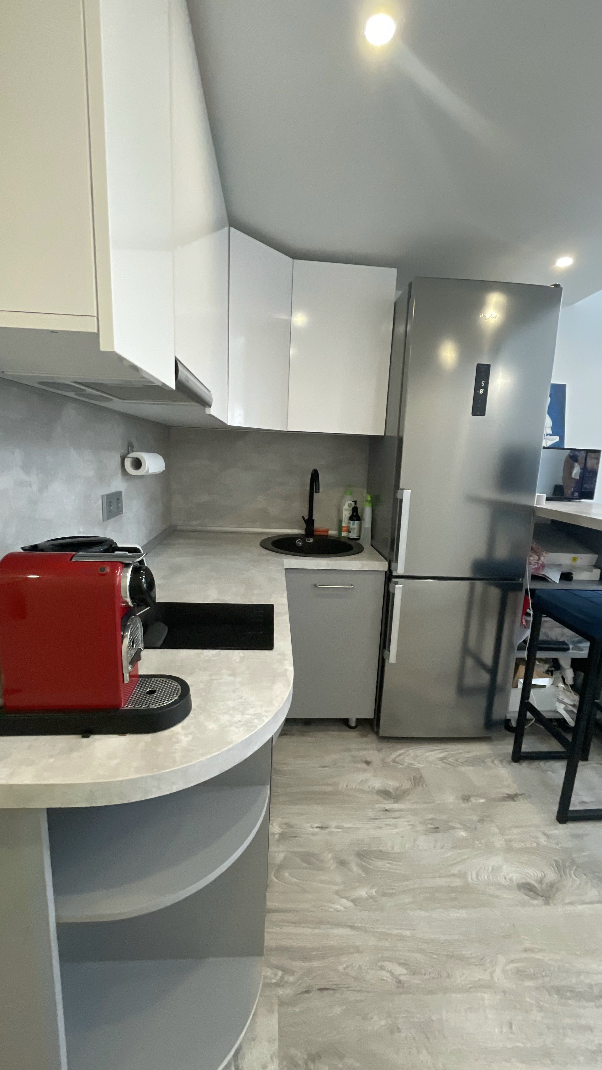 Первый этаж 18,4 м²: кухня- гостиная и санузел.