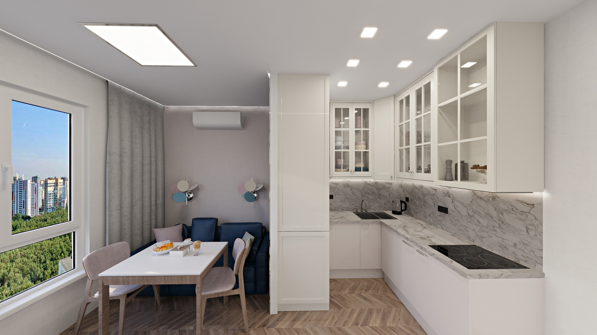 КУХНЯ-ГОСТИНАЯ со всем необходимым, включая уютное место с диваном 180см или 230 см и обеденной зоной у окна.