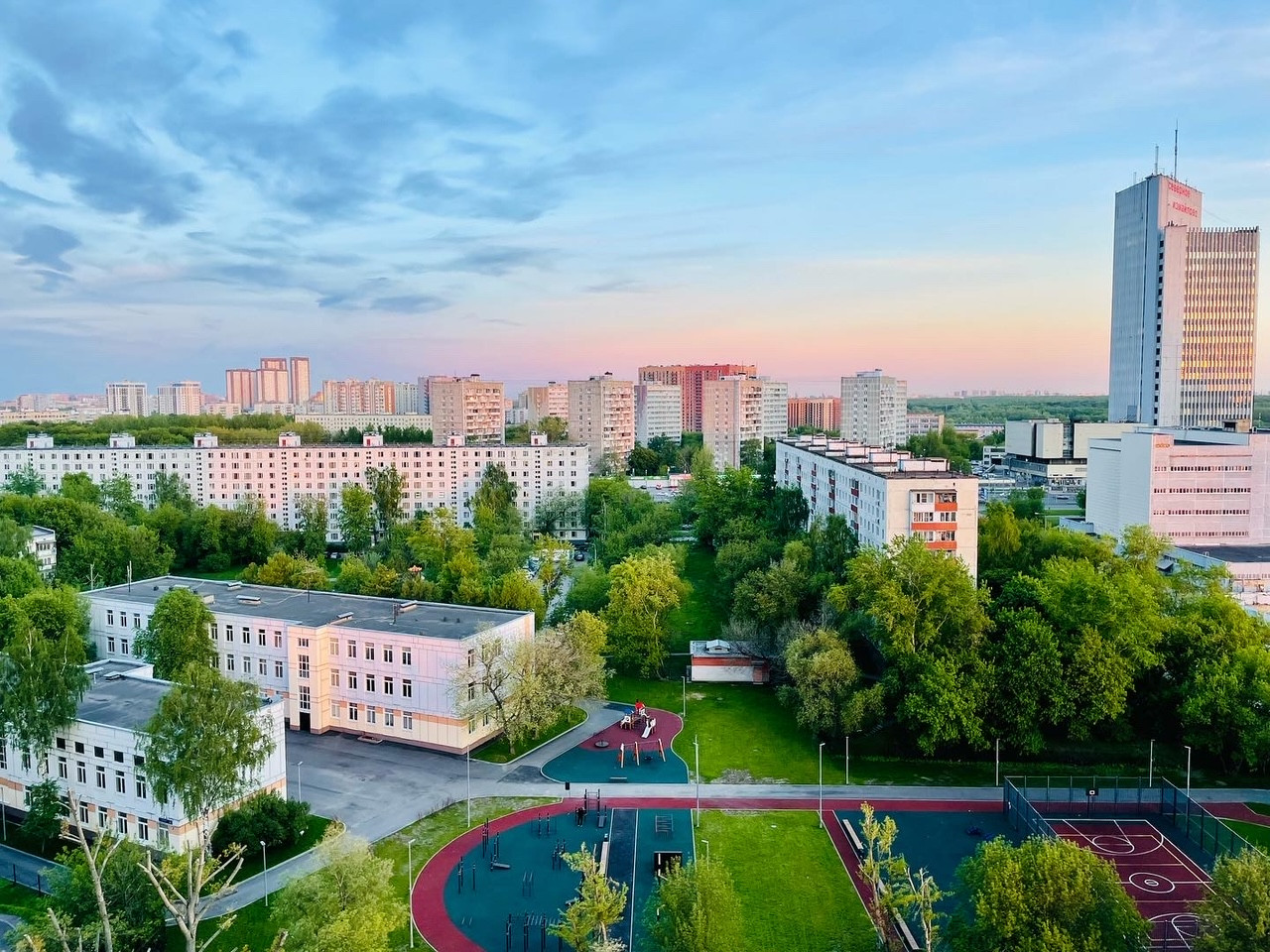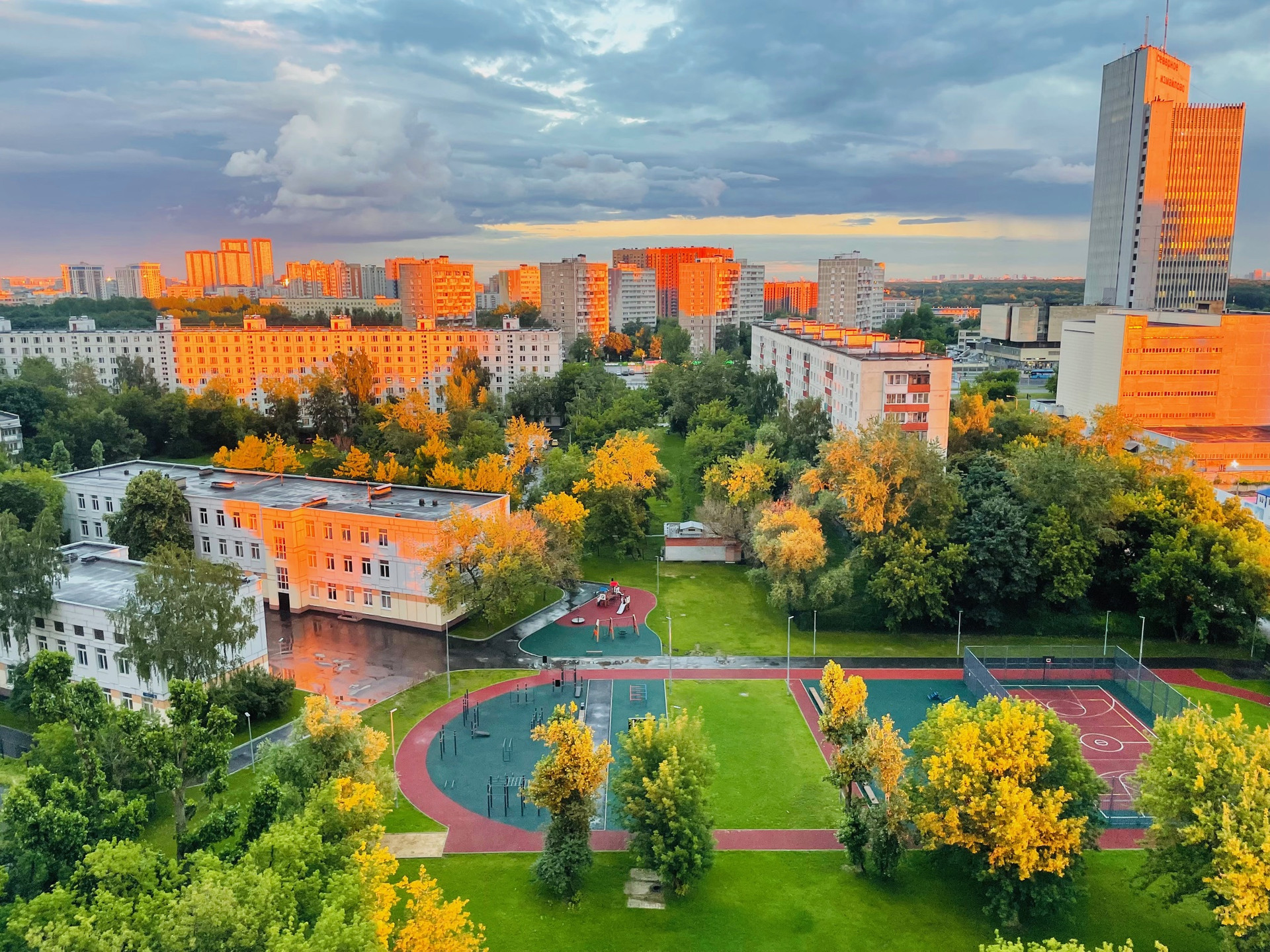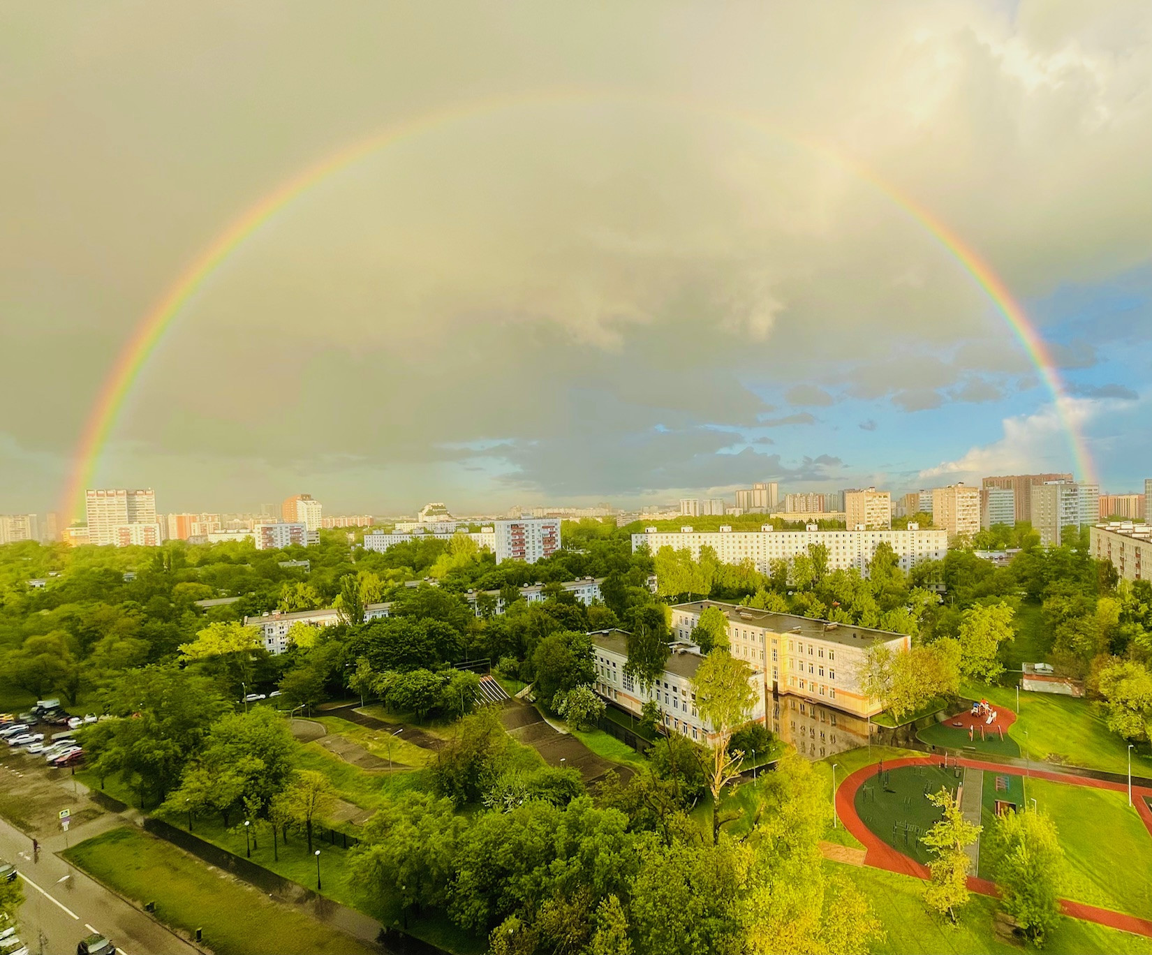Красивый вид из окна на школу и на город (созерцать реновационные стройки вам не грозит). Бонусом, в летний период перед окном, после дождя, появляется панорама радуги. Очень красивая картина, явление частое и греет душу.