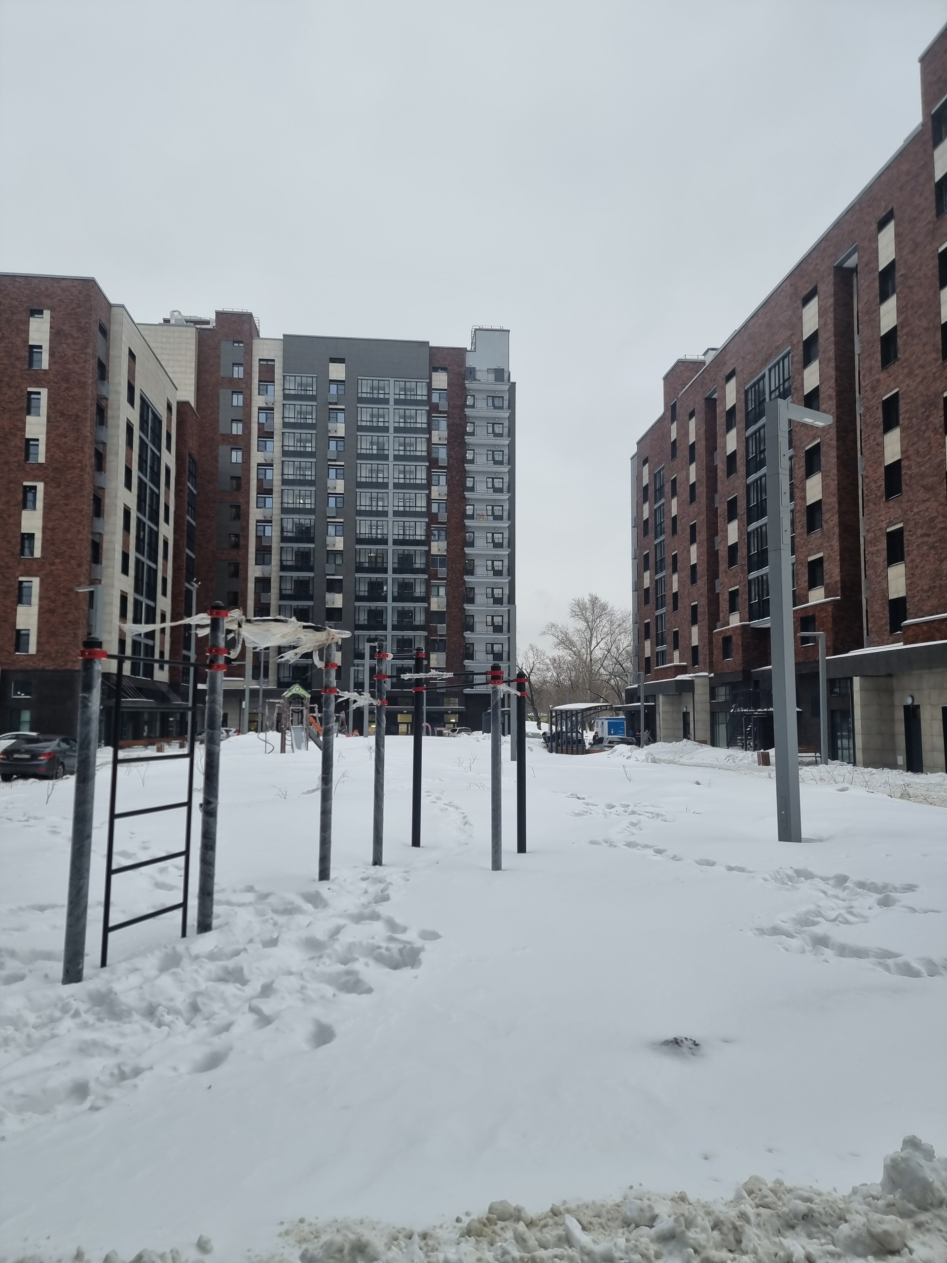 Двор без машин, имеется возможность приобрести подземный паркинг. На самой территории двора благоустроенные детские и спортивные площадки.
