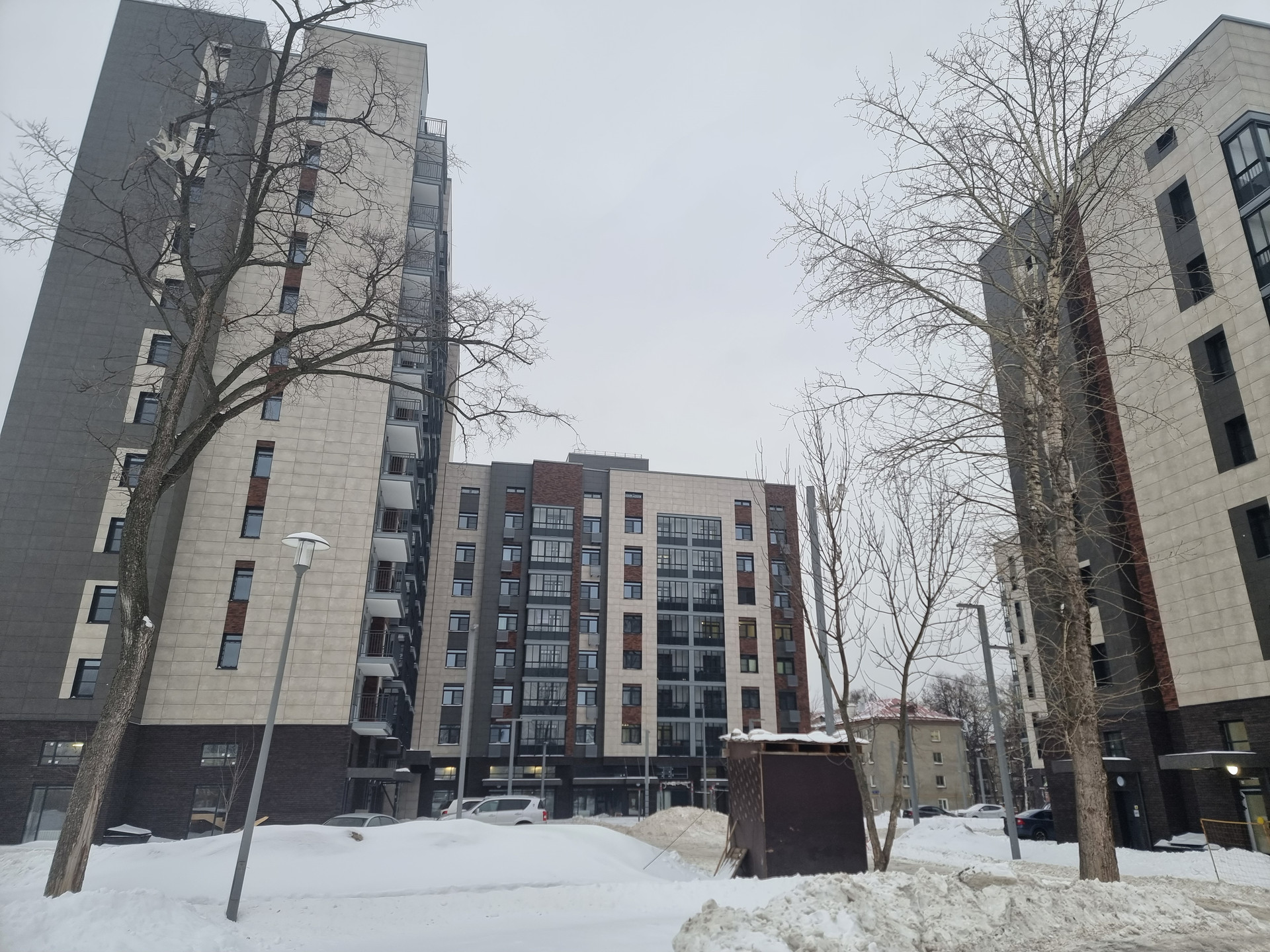 Новый монолитный дом 2023 г.п., состоящий из трех и двухсекционных корпусов переменной этажности. Вентфасады отделаны керамогранитом и клинкерной плиткой, первый этаж облицован кирпичом, входные группы оформлены витражным остеклением.