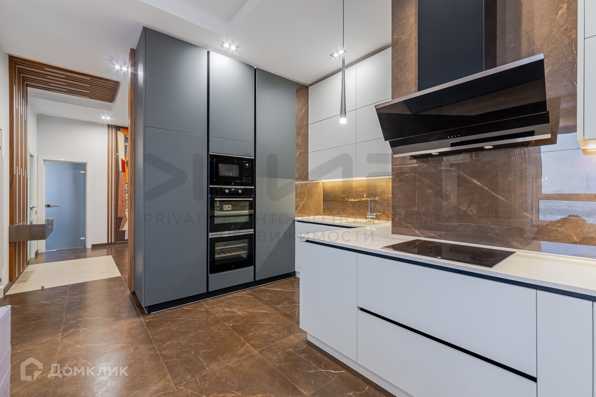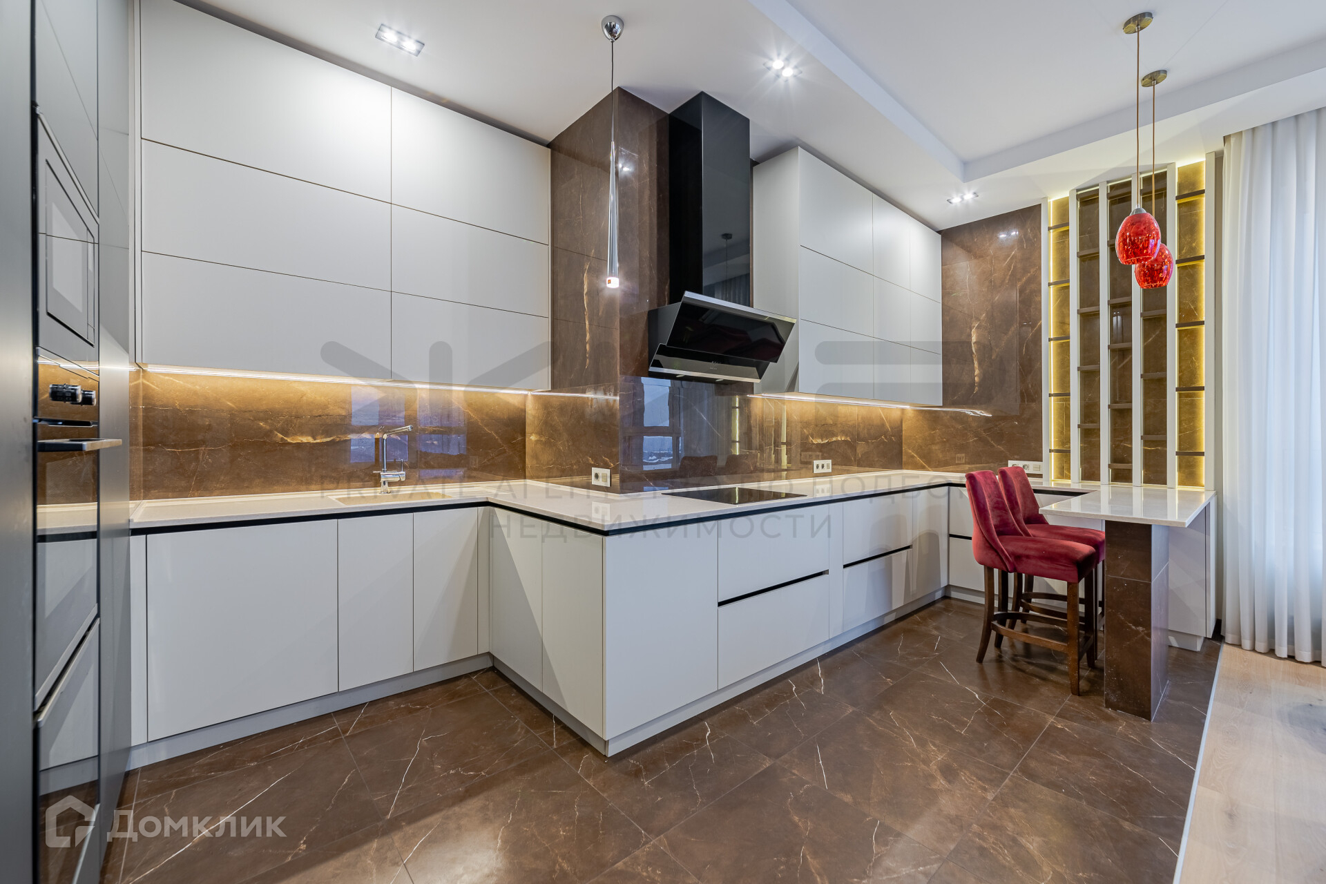 1. Просторная кухня гостиная с угловым остеклением, со встроенным винным шкафом и биокамином.