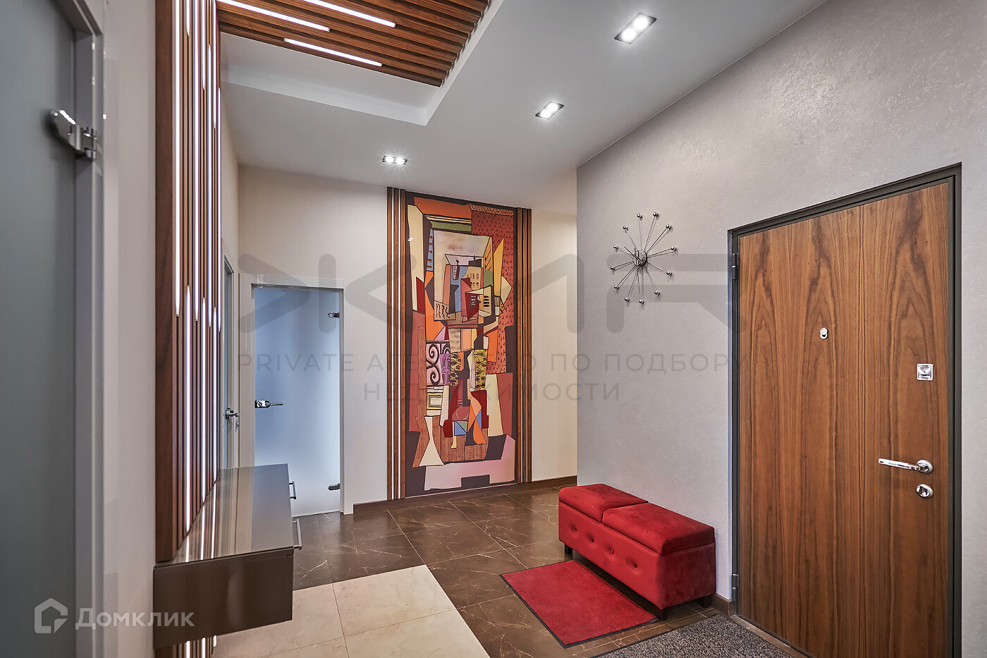 8. Прихожая с декором из натурального дерева с подсветкой.