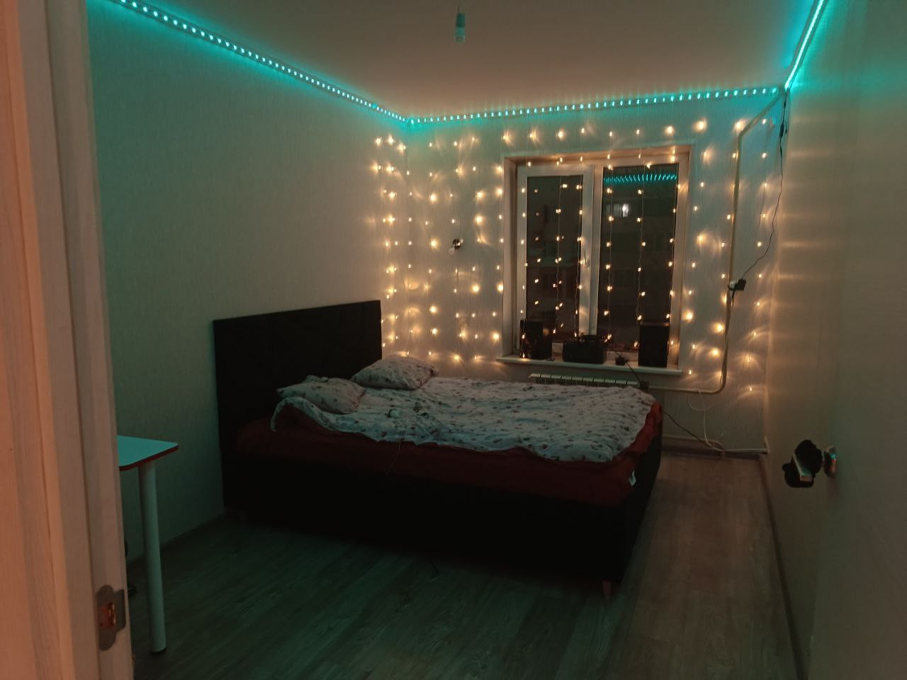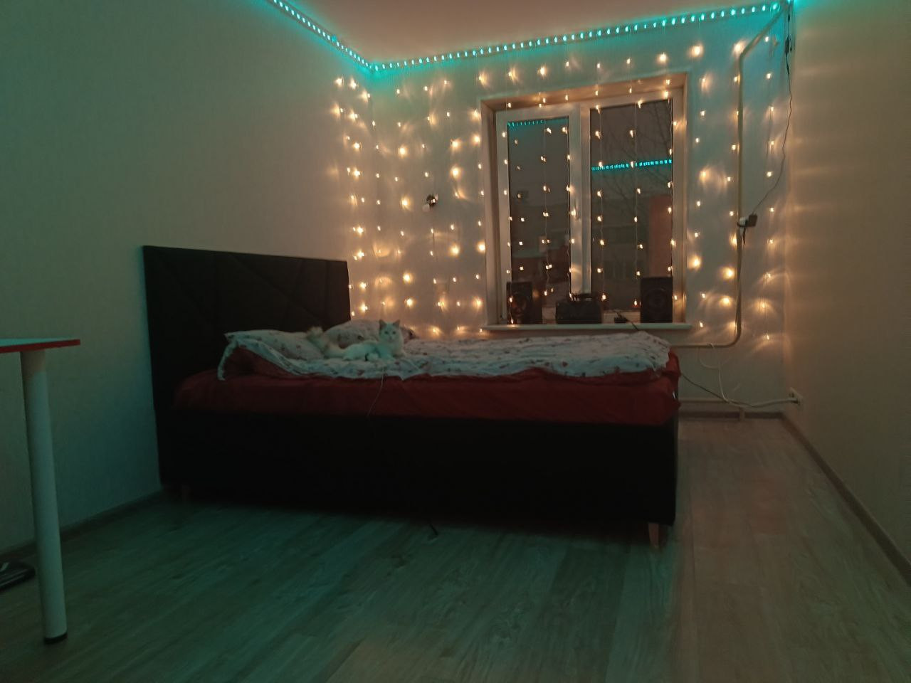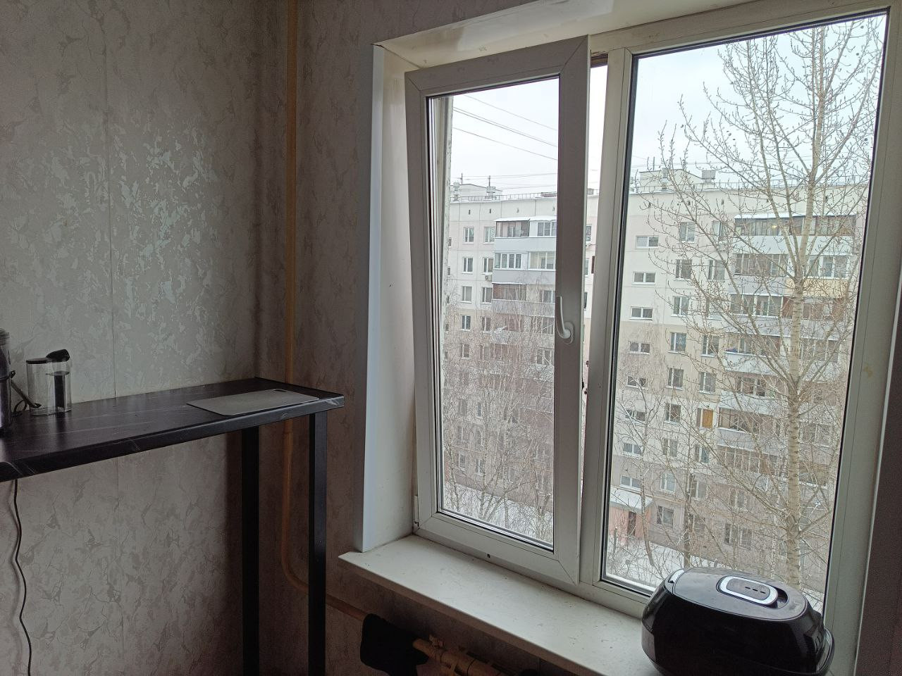 Балкон в поврежденном состоянии, требуется его ремонт (утепление и остекление) потому что на балконе нету одного окна, а два остальных в трещинах, между балконом и комнатой стоит новое большое окно и дверь.