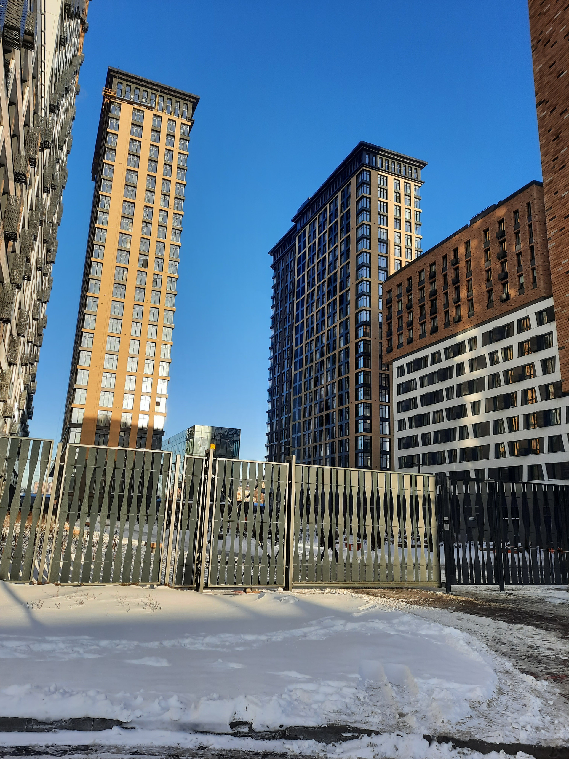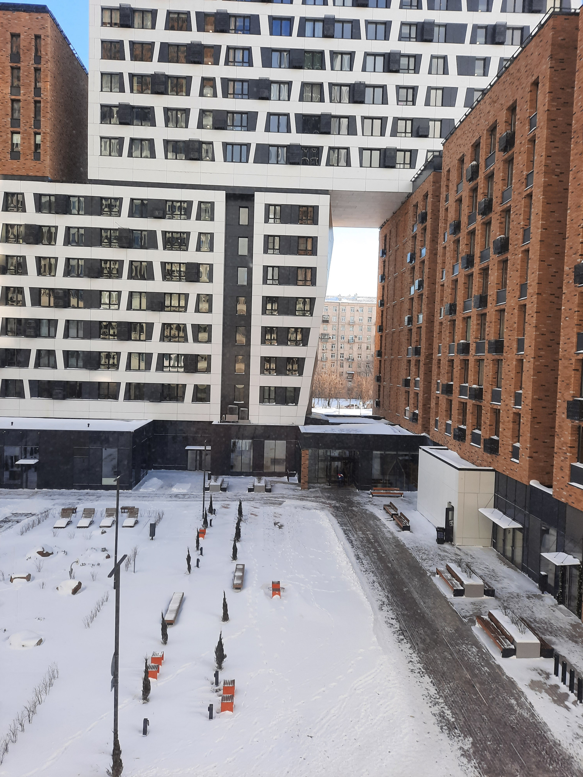 Территория комплекса огорожена, ведётся круглосуточное видеонаблюдение, двор без машин. Проход на территорию осуществляется по смарт-карте. Имеется подземный паркинг с подъемом на этаж. Во дворе есть детская и спортивная площадки. В центральном лобби расположена игровая комната, оборудованы колясочные и лапомойки.