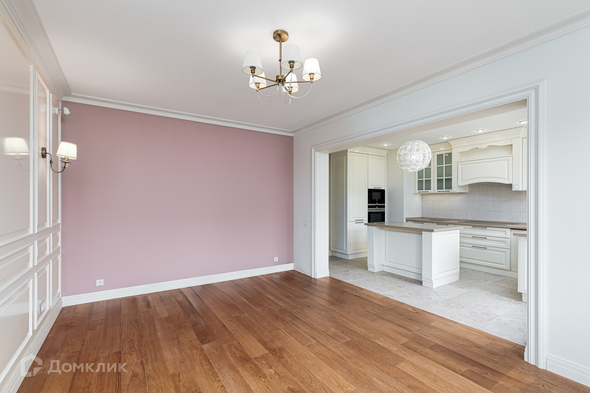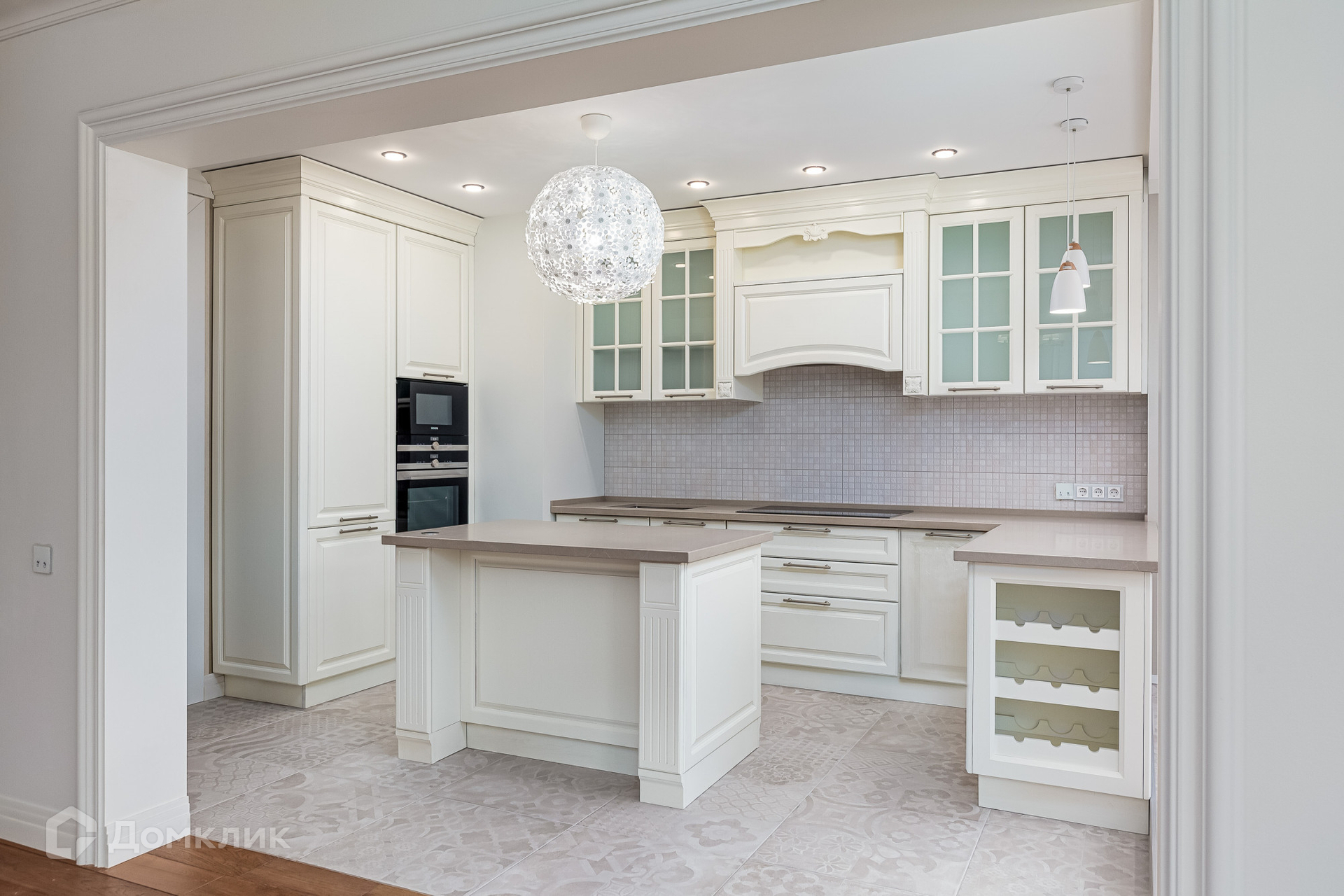 Эффектная комфортная планировка, два входа в квартиру, качественные материалы, мебель (на фото) и премиальная кухонная техника и светильники.