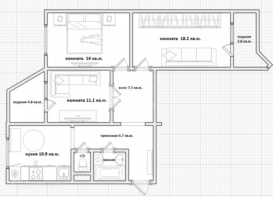 Площадь кухни 10.9 м2