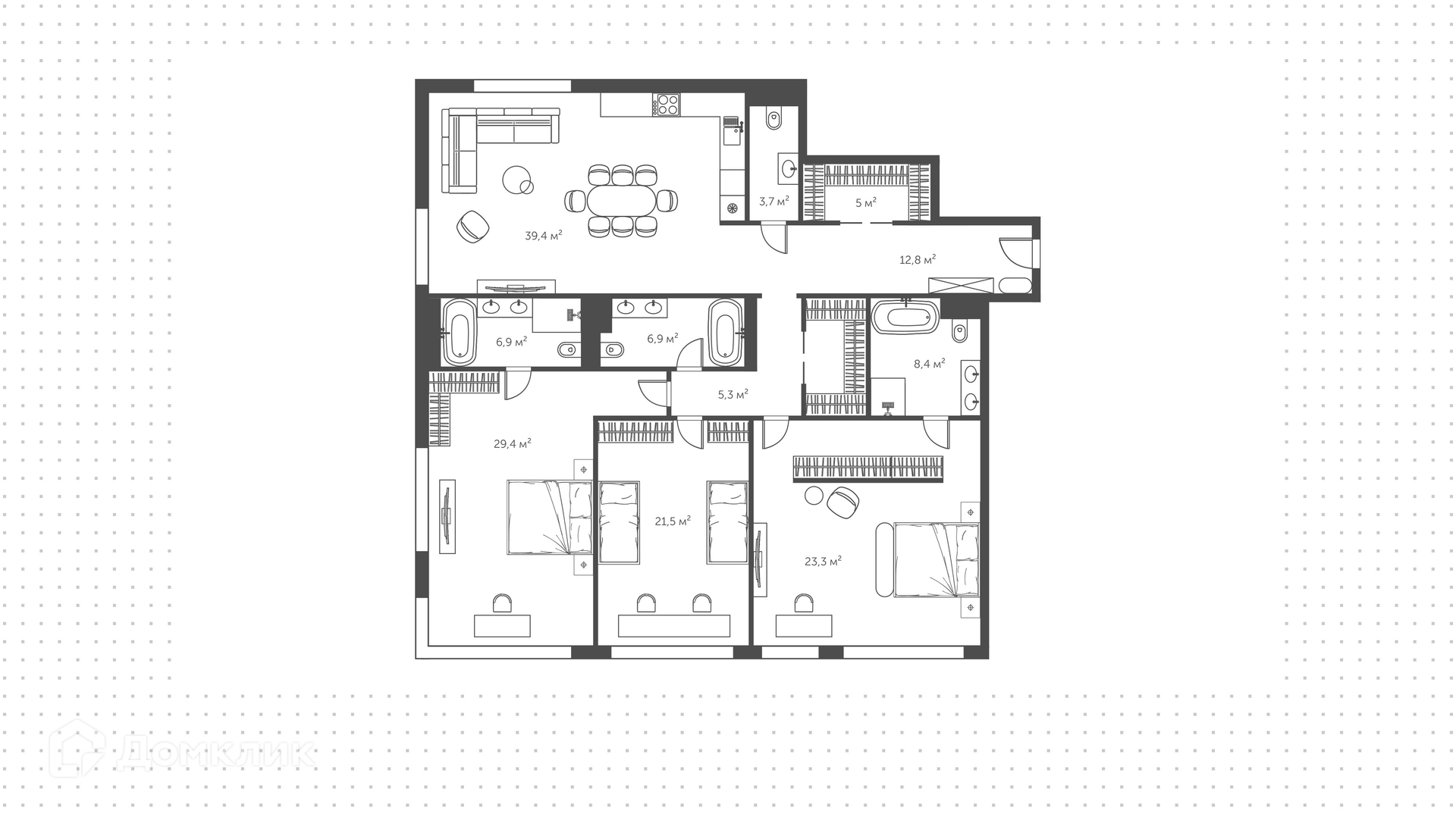 Свободная планировка позволяет организовать кухню-гостиную, три спальни с санузлами, две гардеробные, гостевой санузел, прихожую.