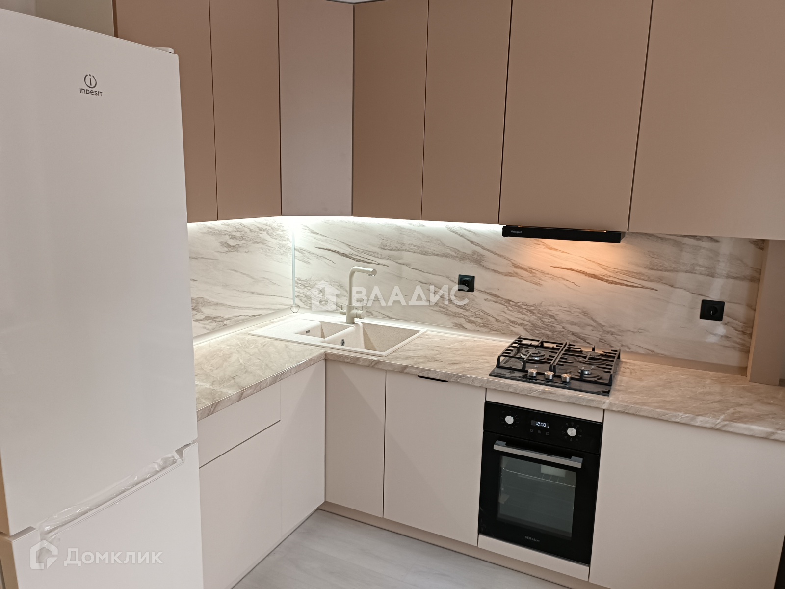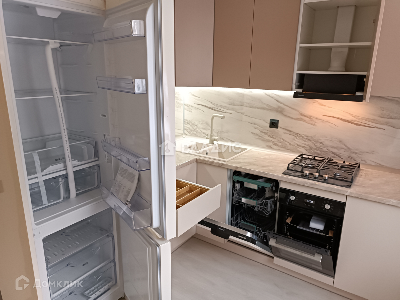 Кухня угловая на заказ, фирма "Беккер", посудомоечная машина, электрический духовой шкаф, газовая варочная поверхность, сенсорная подсветка, высокий новый холодильник, система очистки питьевой воды, новая вентиляция.