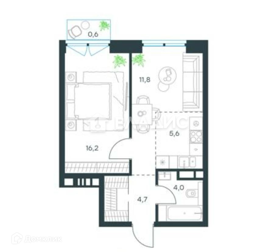 Общая площадь 43.6 м2