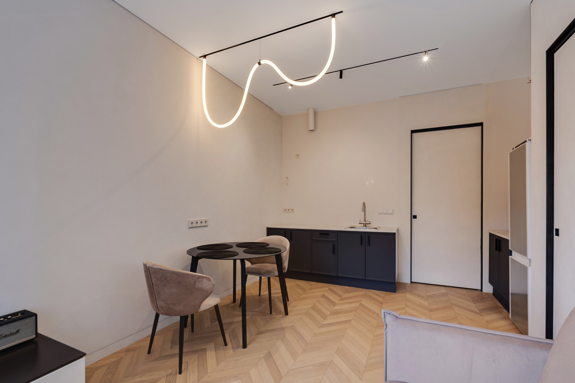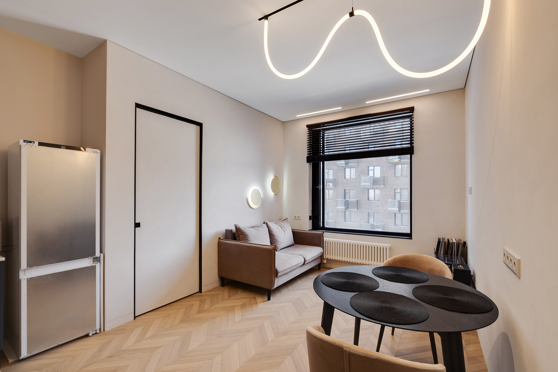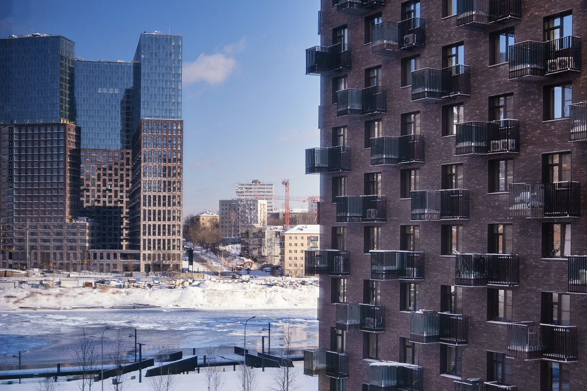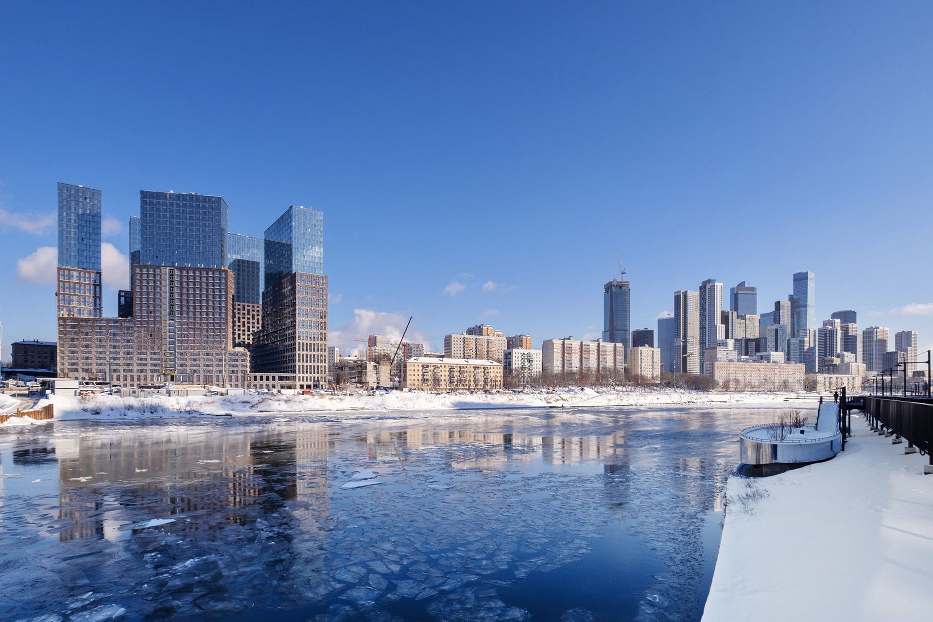 Функциональная планировка квартиры: просторная кухня-гостиная, изолированная мастер-спальня со своей гардеробной, два санузла, просторный холл. Высокие потолки 2.85 м, панорамные окна. Дизайнерская обстановка, качественная мебель. Квартира оборудована бытовой техникой: стиральная машина,  холодильник, микроволновая печь. Тёплые полы в зоне санузлов и холл. Множество сценариев освещения. ЖК "Береговой" - комплекс бизнес-класса расположен на берегу Москвы-реки в районе Фили. Фасад облицован анодированным алюминием и клинкерным кирпичом. В главном лобби обустроена лаунж-зона с диванами и камином.