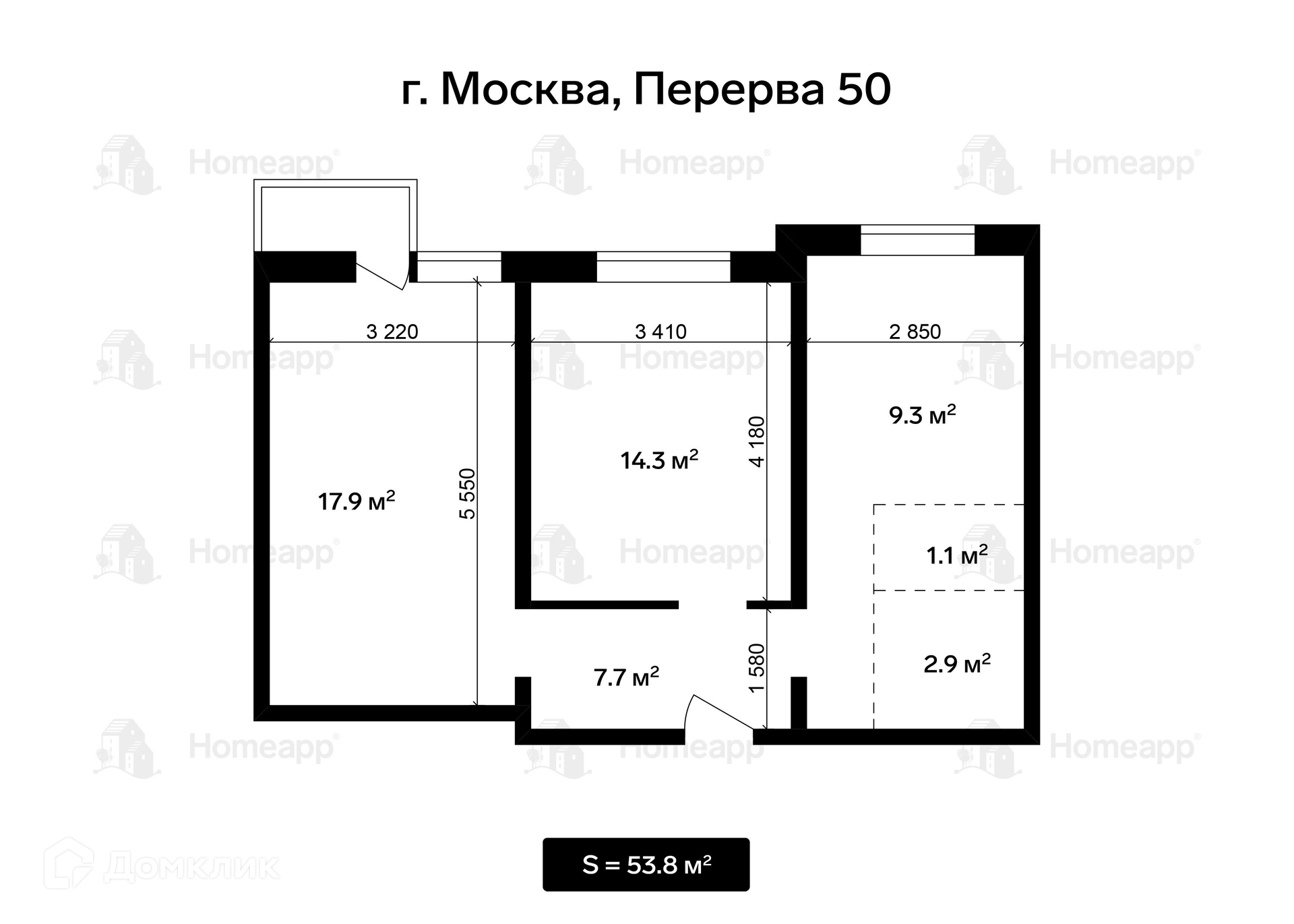 Общая площадь 53.8 м2
