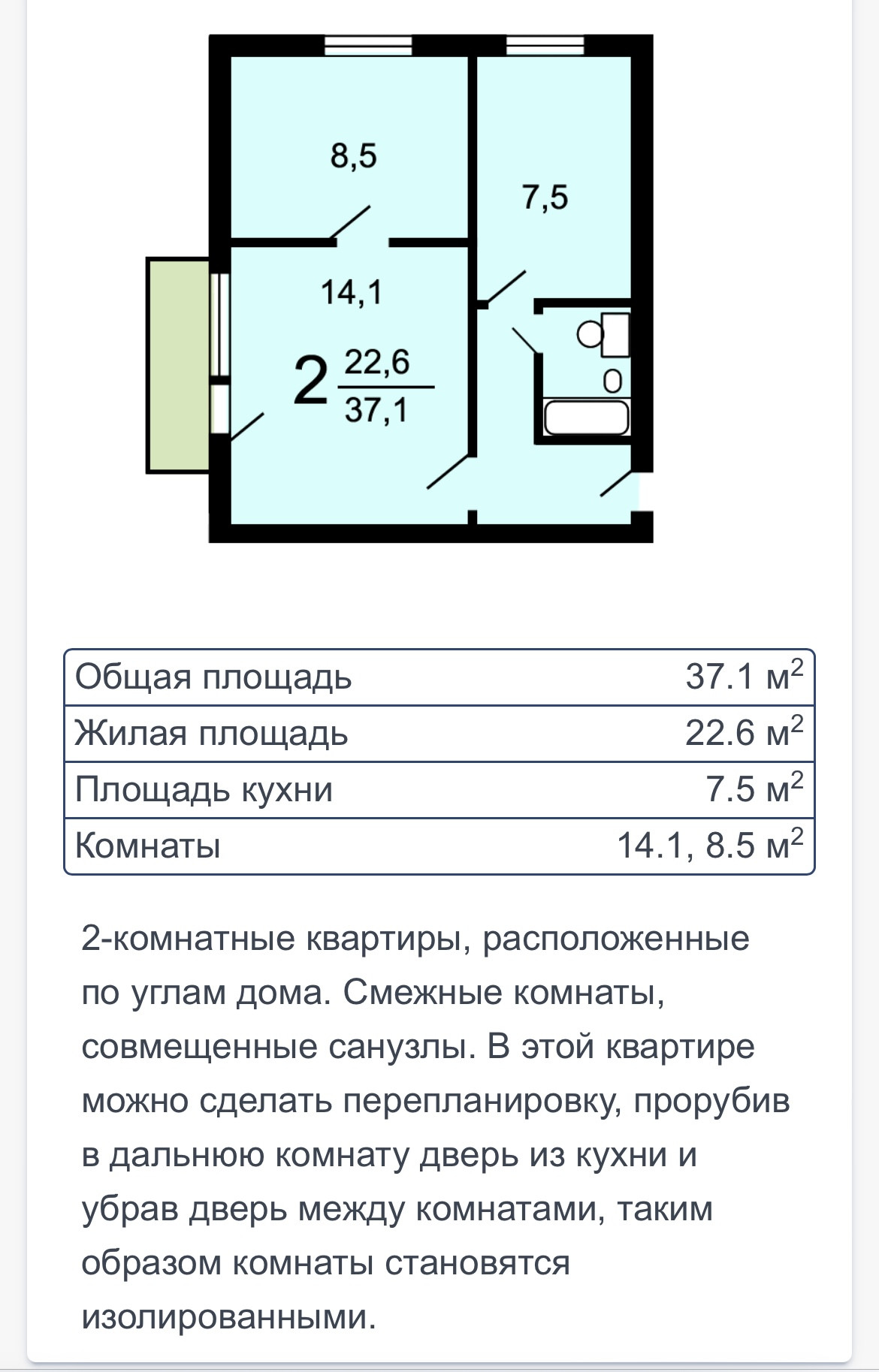 Общая площадь 37.3 м2