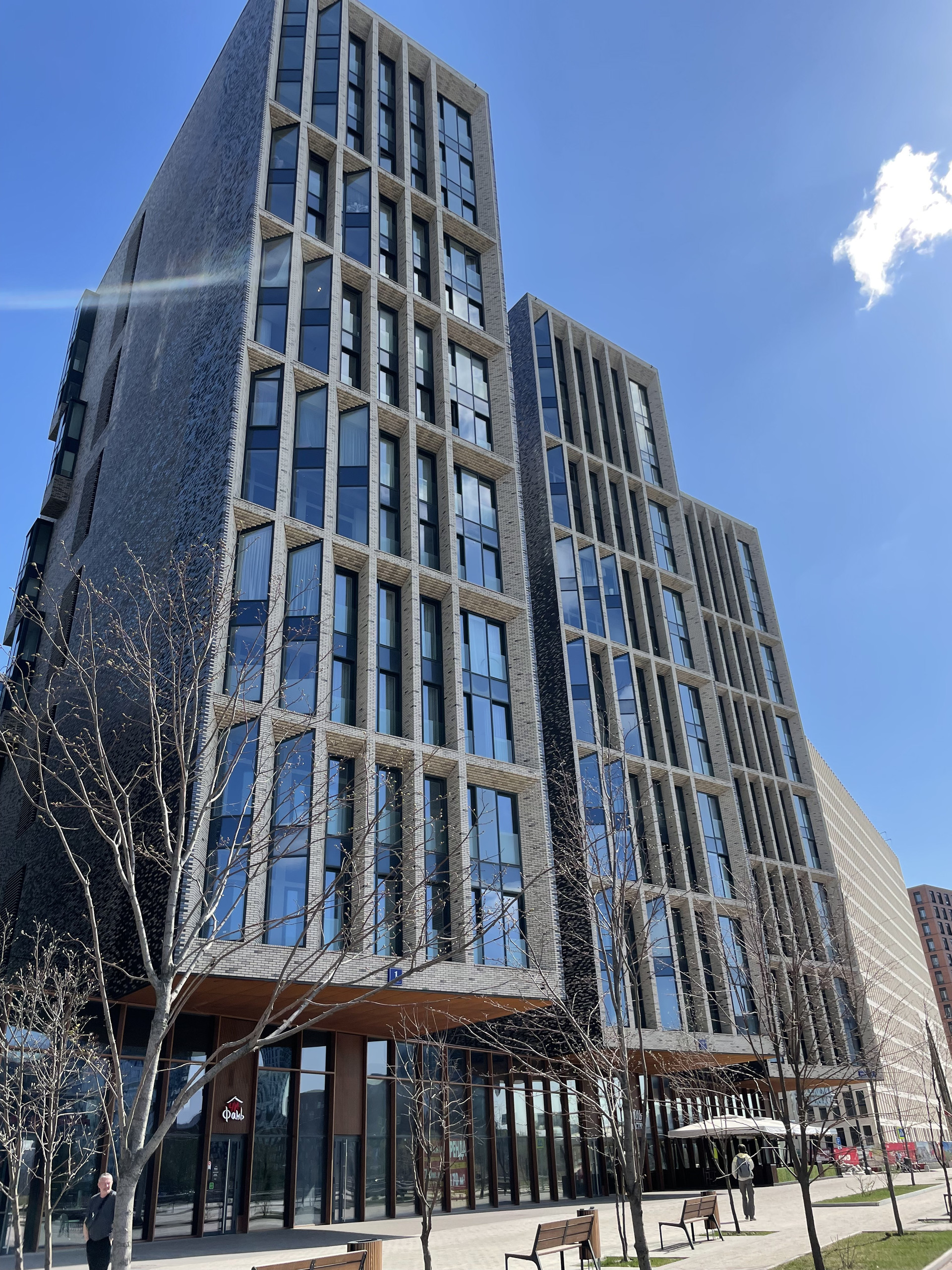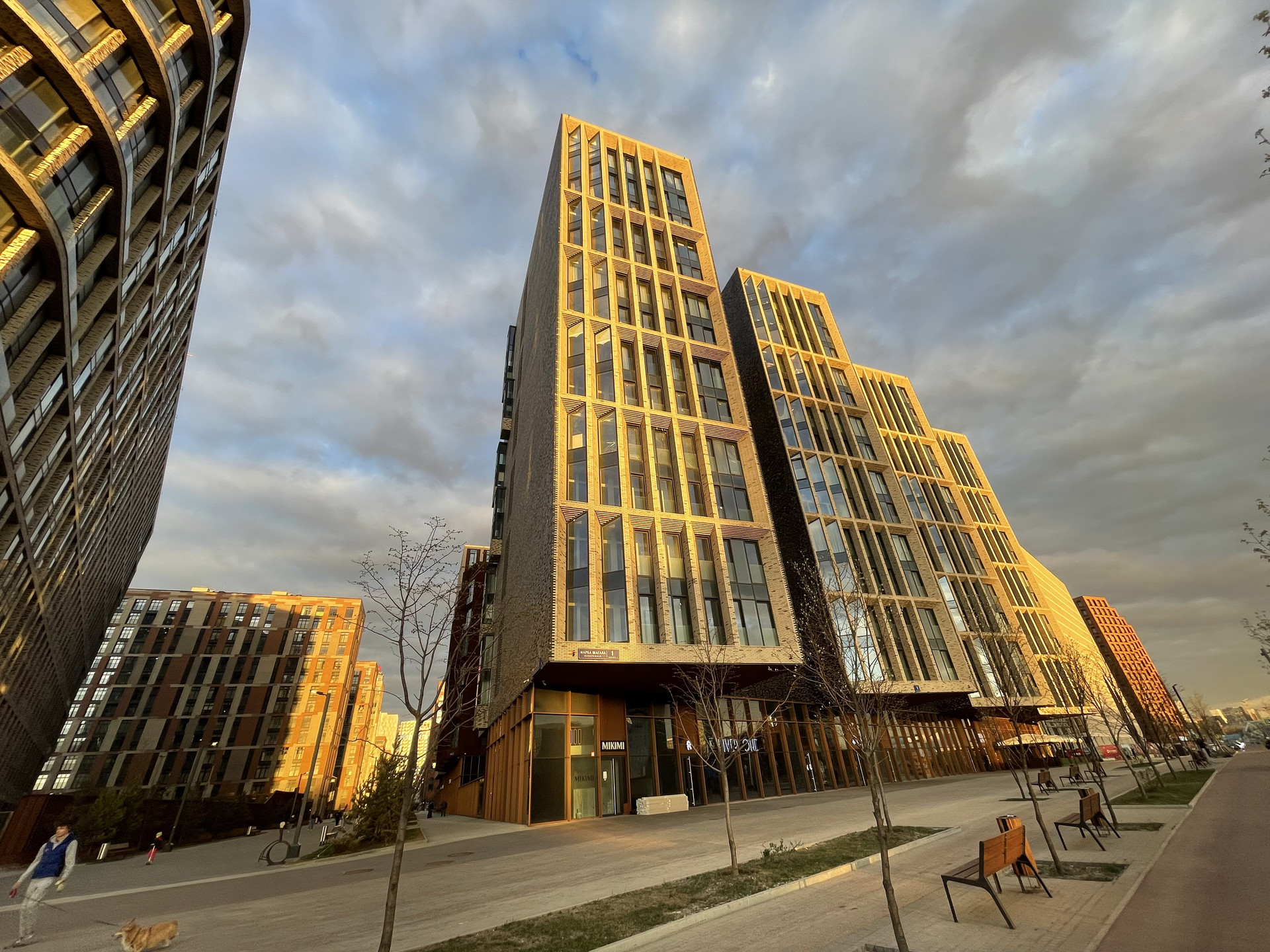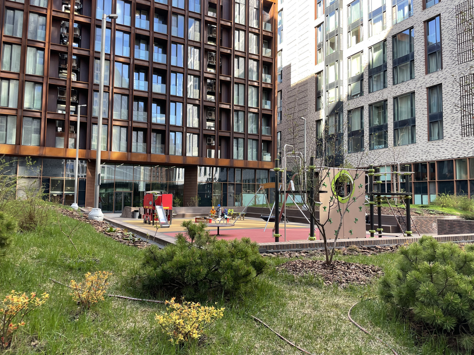 Ухоженный, просторный зелёный двор, закрытая территория; вход во двор с улицы через охрану; на территории двора обустроена современная детская площадка с прорезиненным покрытием и снарядами для разных возрастов. В подъезде есть колясочная комната, а также комната для помывки лап домашних питомцев. Подземный паркинг расположен на -1 и -2 этажах дома, куда можно спуститься на лифте прямо от квартиры; на территории подземного паркинга работает автомойка.