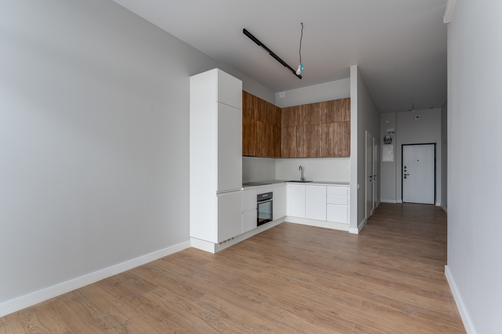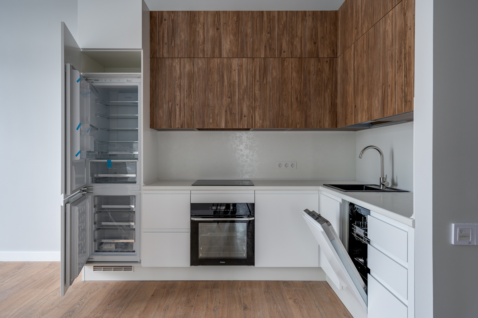Функциональная планировка включает в себя просторную кухню-гостиную, три изолированные спальни, два санузла и большую гардеробную комнату. Ремонт выполнен в теплых тонах, которые создают атмосферу домашнего уюта. Кухонный гарнитур выполнен в светлых оттенках, оснащен всей необходимой техникой: холодильником, духовым шкафом, варочной поверхностью, стиральной и посудомоечной машинами. Вам останется только добавить в интерьер свою мебель и аксессуары.