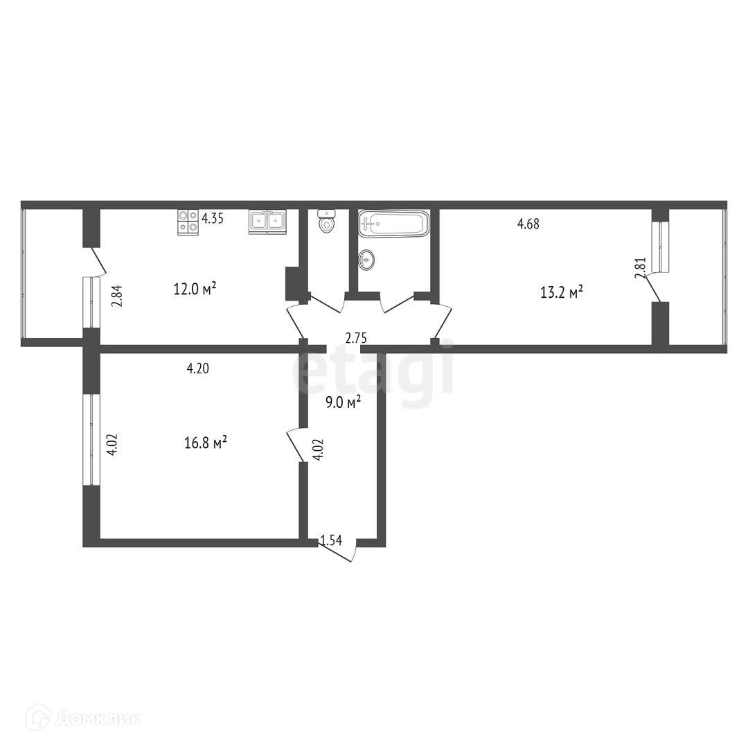 Квартира формата распашонка, общей площадью 55 кв.м, просторная кухня 12 кв.м., 2 изолированные комнаты 18,8 кв.м., 13,2 кв.м., 2 балкона, совмещенный с/у.