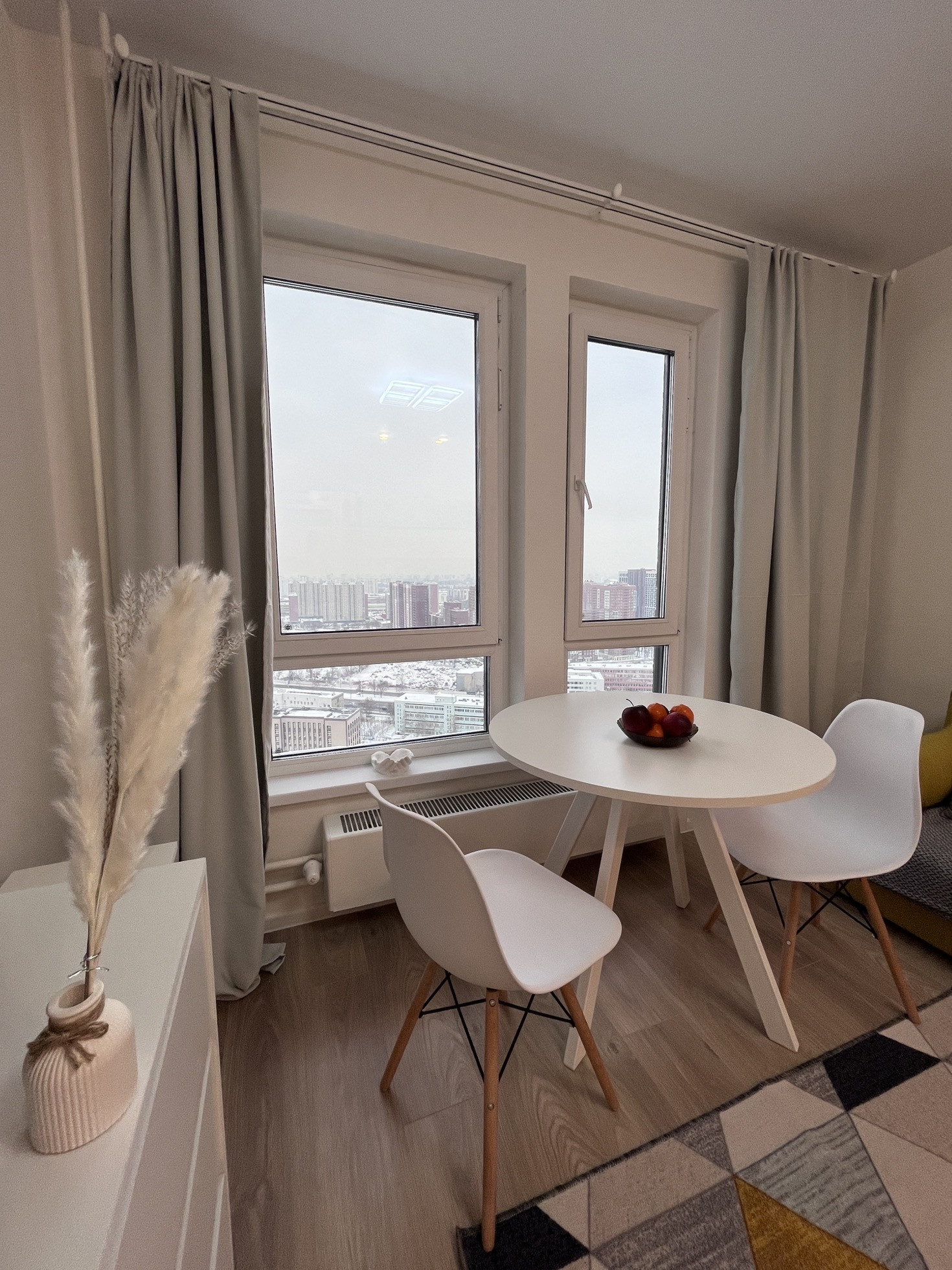 В комнате - большое окно, красивый вид на город.