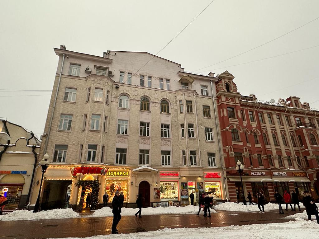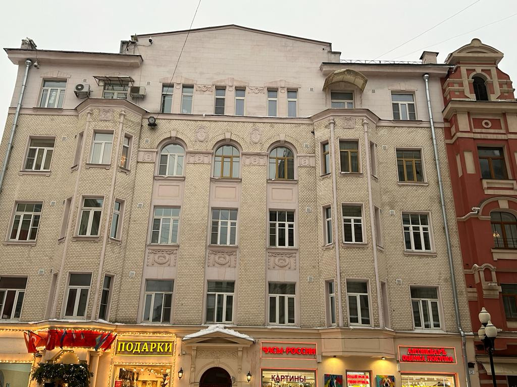 Пятикомнатная квартира в самом сердце Москвы, с выходом прямо на старый Арбат, в доходном доме 1910 года постройки.  Неподалёку расположен театр имени Е. Вахтангова дом-мастерская Константина Мельникова, множество музеев, магазинов, ресторанов. 3-й этаж. Окна на Арбат и во двор. Есть лифт, консьерж.