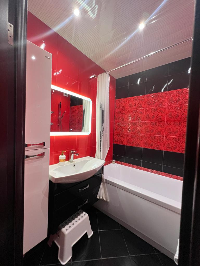 Пол в комнатах - ламинат высшего качества, кухня, прихожая и коридор - керамогранит Италия, отличные межкомн. двери - массив дерева с витражами, ровные стены, потолки, заменили все - проводка, автоматы, трубы, водоразводка, розетки, немецкая сантехника и краны, красивая импортная плитка в ванной комнате и туалете, плюс мебель в ванной, кухня - немецкий встроенный кухонный гарнитур (делали на заказ - массив бука, каменная столешница, фартук - закаленное стекло, само собой везде импортн.доводчики, газ.амортиз. и пр.), встр. бытовая техника - варочная панель, духов.шкаф и вытяжка, холодильник, обеденный гарнитур, в прихожей шкаф - купе, возможно обсудим мебель в комнатах, хорошие стеклопакеты, сейфовая входная дверь, потолки высокие, вообще квартира - светлая, теплая и уютная, симпатичный вид из окон, тихо, очень удобная планировка, можно сразу заезжать и жить (!!!), делали ремонт и покупали все для себя, не экономили!