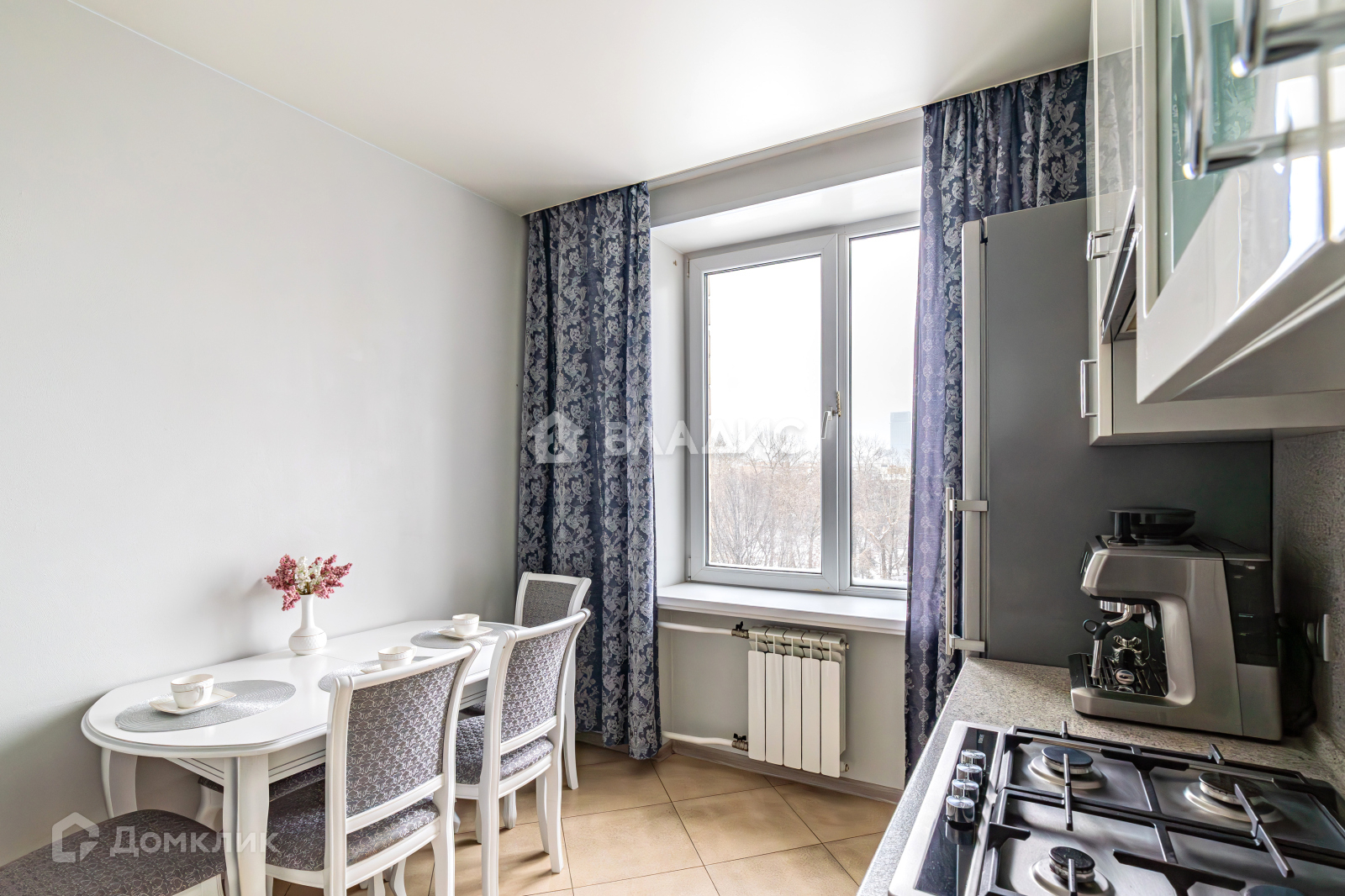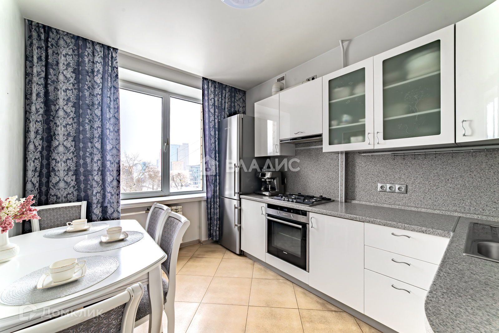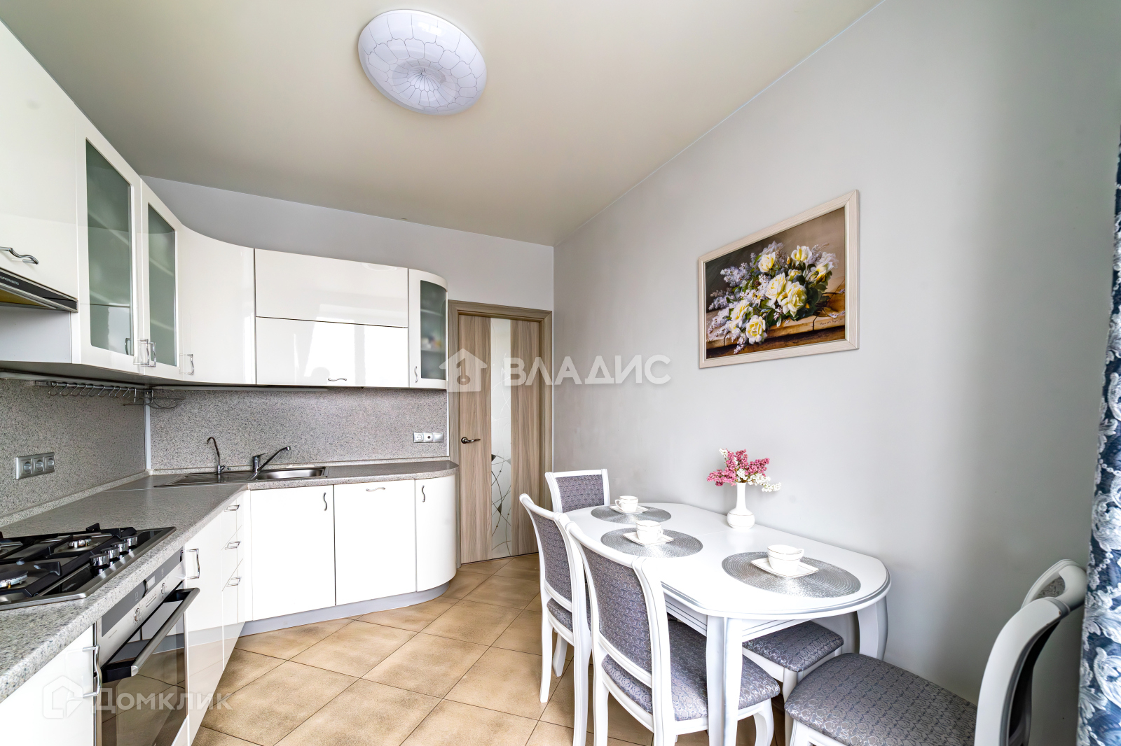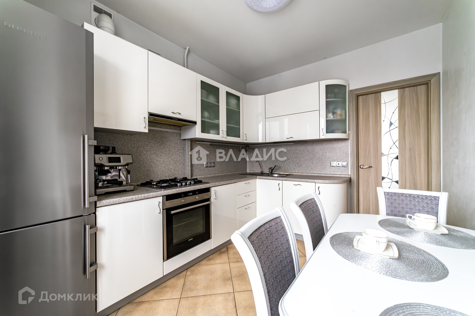 Кухня имеет угловую мебель со встроенной бытовой техникой изготовленной в Германии. Электрический  духовой шкаф SIEMENS, газовая варочная  панель SIEMENS, посудомоечная машина SIEMENS, холодильник LIEBHERR производство Германия, вытяжка KUPPERSBERG производство Германия.  Кухонный стол и стулья изготовлены из массива дерева.