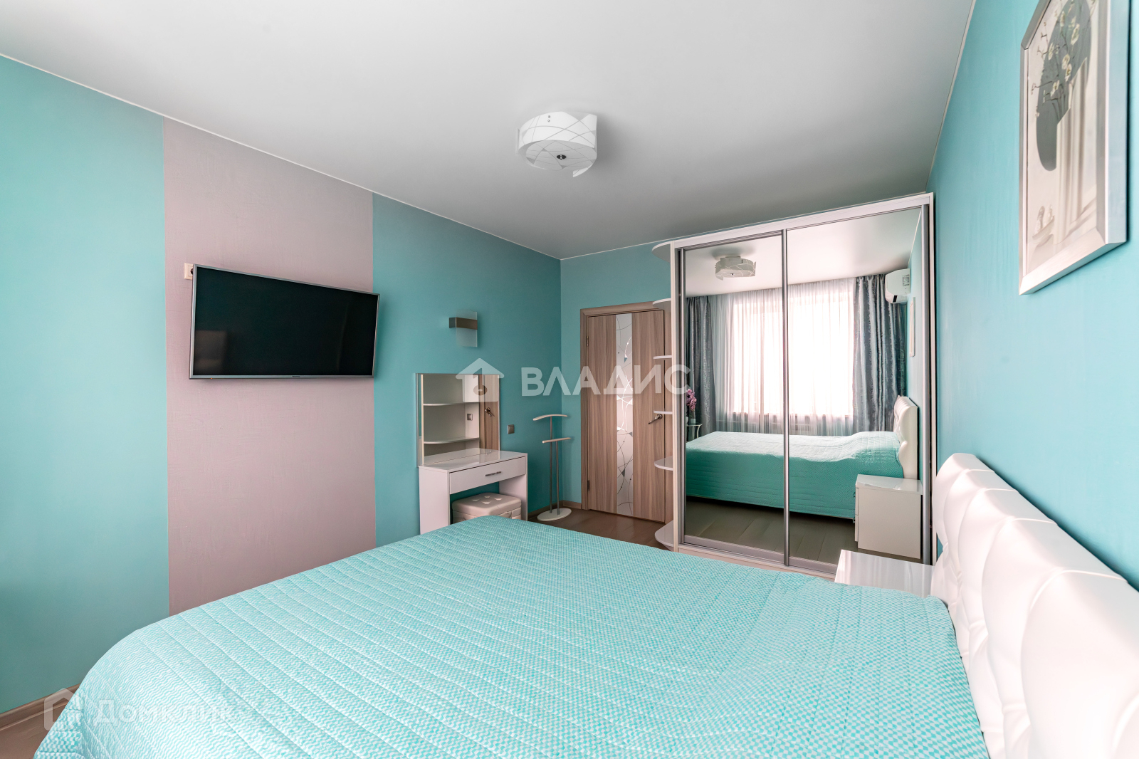 Спальня площадью 13,6 кв.м оснащена мебелью: двухспальная кровать с подъёмным механизмом,  шкаф-купе, прикроватные тумбочки и туалетный столик выполнены на заказ по индивидуальным размерам.