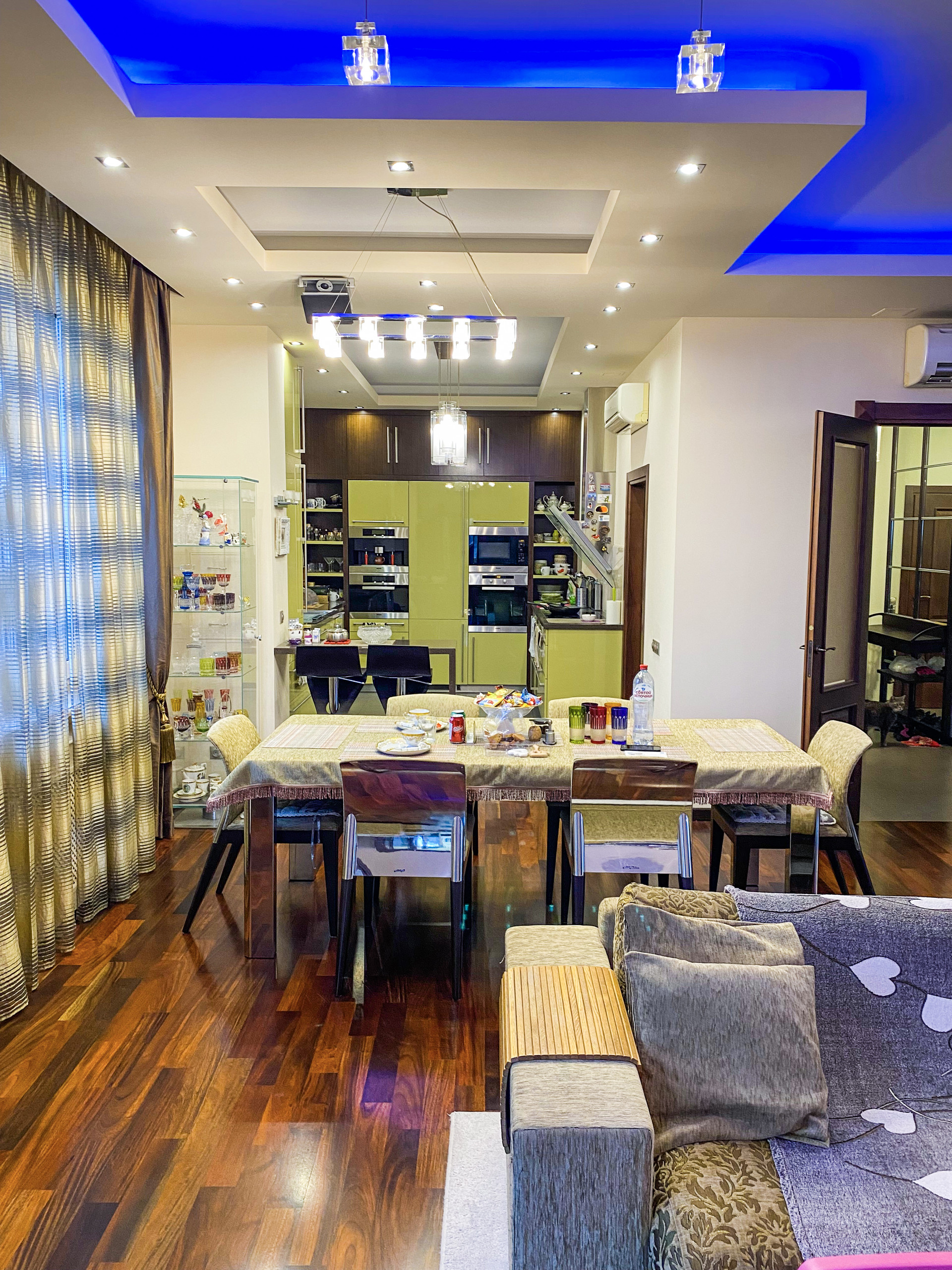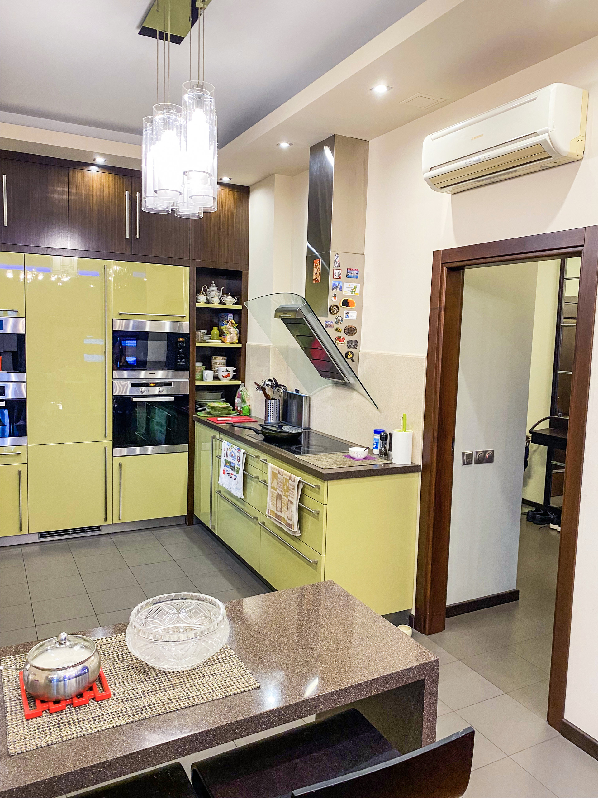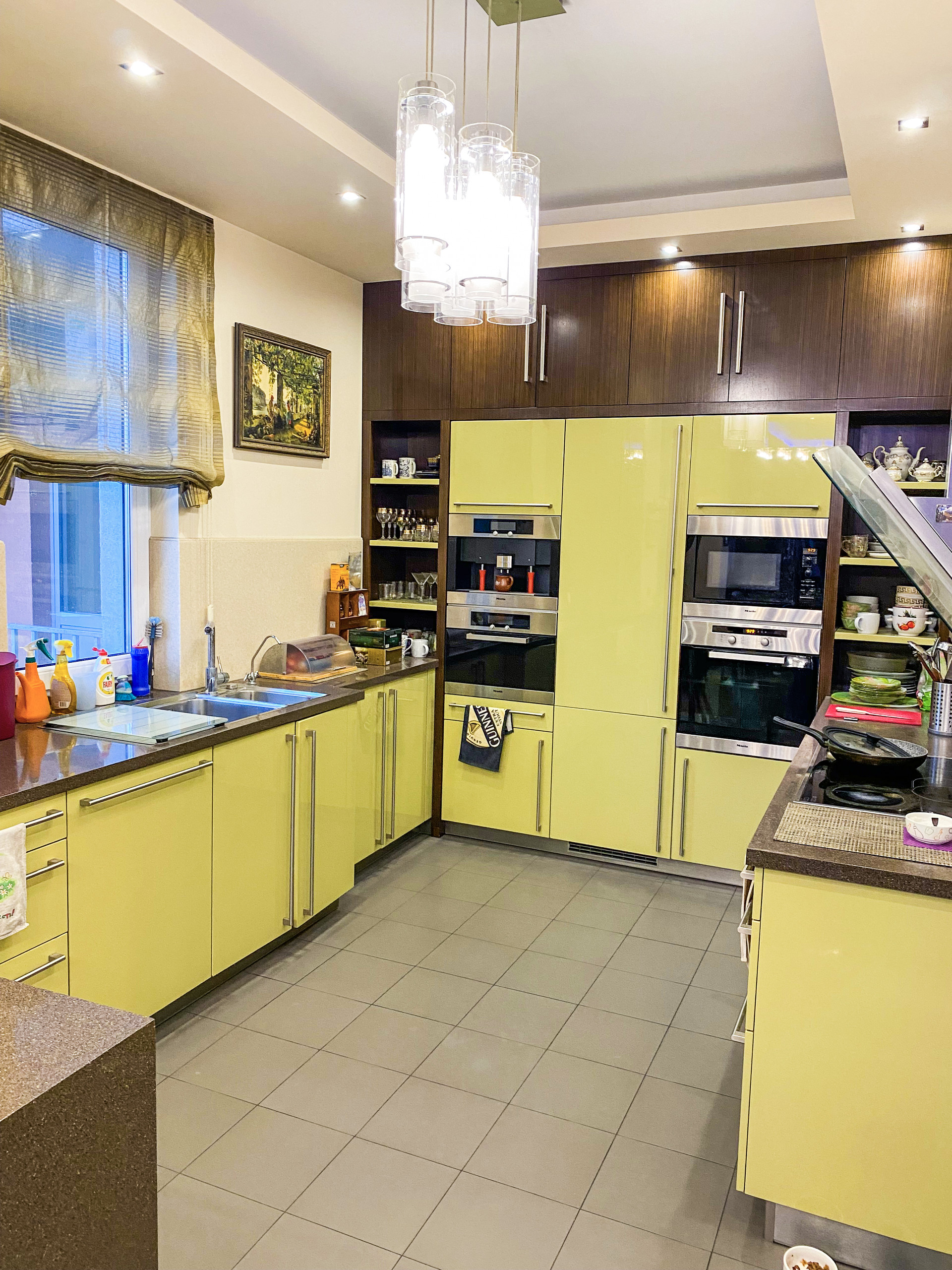 - техника Miele на кухне: духовка, паровая печь, микроволновая печь, варочная панель, вытяжка, посудомойка, кофемашина и стиральная машина, два холодильника Liebheer;